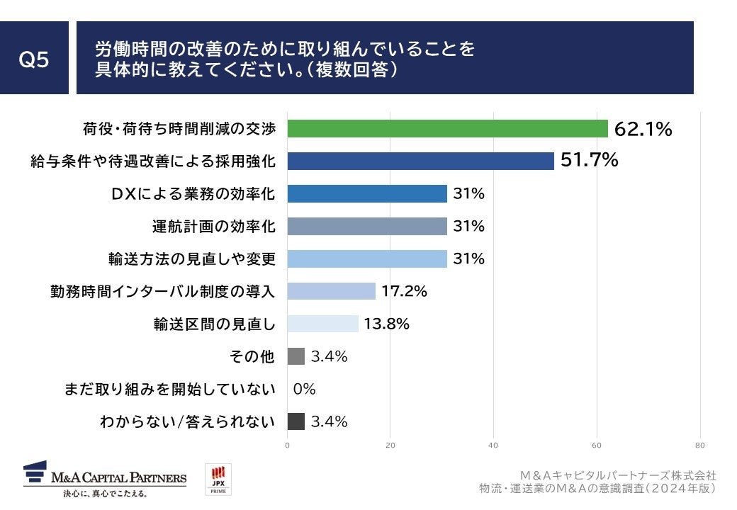 Q4で「労働時間の改善(生産性の向上)」と回答した方に、「Q5.労働時間の改善のために取り組んでいることを具体的に教えてください。(複数回答)」(n=29)と質問したところ、「荷役・荷待ち時間削減の交渉」が62.1%、「給与条件や待遇改善による採用強化」が51.7%という回答となりました。