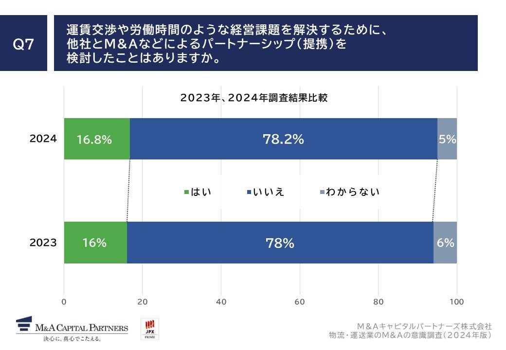 「Q7.運賃交渉や労働時間のような経営課題を解決するために、他社とM&Aなどによるパートナーシップ(提携)を検討したことはありますか。」(n=101)と質問したところ、「はい」が16.8%、「いいえ」が78.2%という回答となりました。