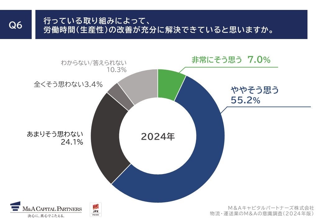 「Q6.行っている取り組みによって、労働時間(生産性)の改善が充分に解決できていると思いますか。」(n=29)と質問したところ、「非常にそう思う」が7.0%、「ややそう思う」が55.2%という回答となりました。