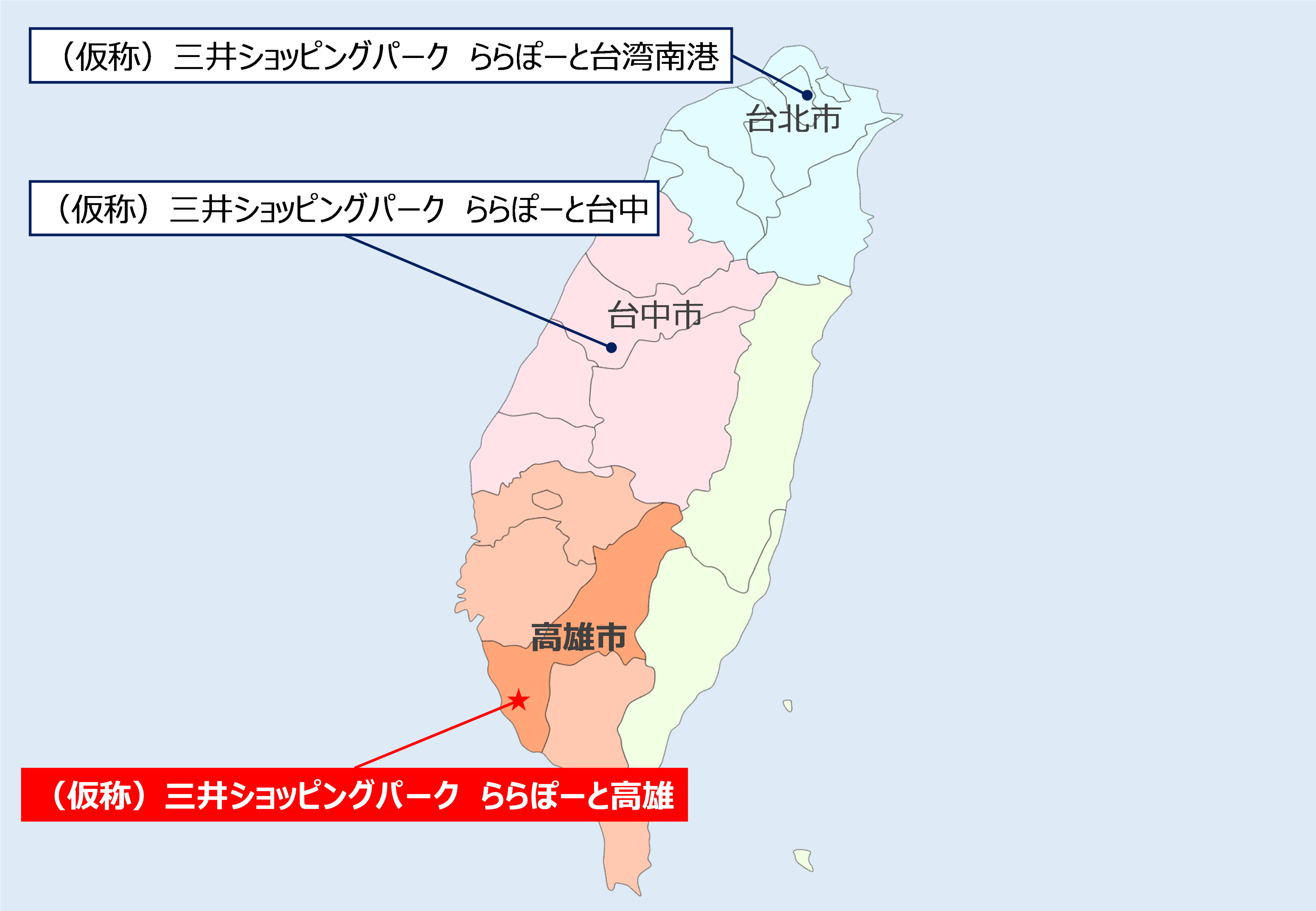 当社は、台中市で2022年に開業予定の「(仮称)三井ショッピングパーク ららぽーと台中」、台北市で2023年に開業予定の「(仮称)三井ショッピングパーク ららぽーと台湾南港」の開発を推進しています。本計画は台湾における3施設目の「ららぽーと」事業で、北部、中部に続く、南部のフラッグシップ施設の位置づけとなります。なお、開業済みの「三井アウトレットパーク 台湾林口」、「三井アウトレットパーク 台中港」、「三井アウトレットパーク 台南」を含めると、台湾6施設目の商業施設となります。
