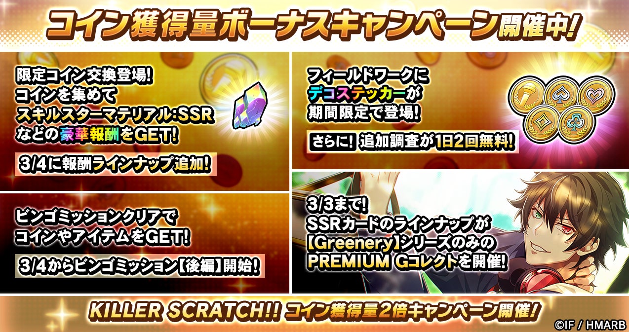 「スキルスターマテリアル:SSR」など豪華アイテムと交換できる限定コイン交換をはじめ、ビンゴミッションやログインボーナス、KILLER SCRATCH!!をプレイした際のコイン獲得量が2倍になるキャンペーンなどを開催しています。詳細はアプリ内お知らせをご確認ください。