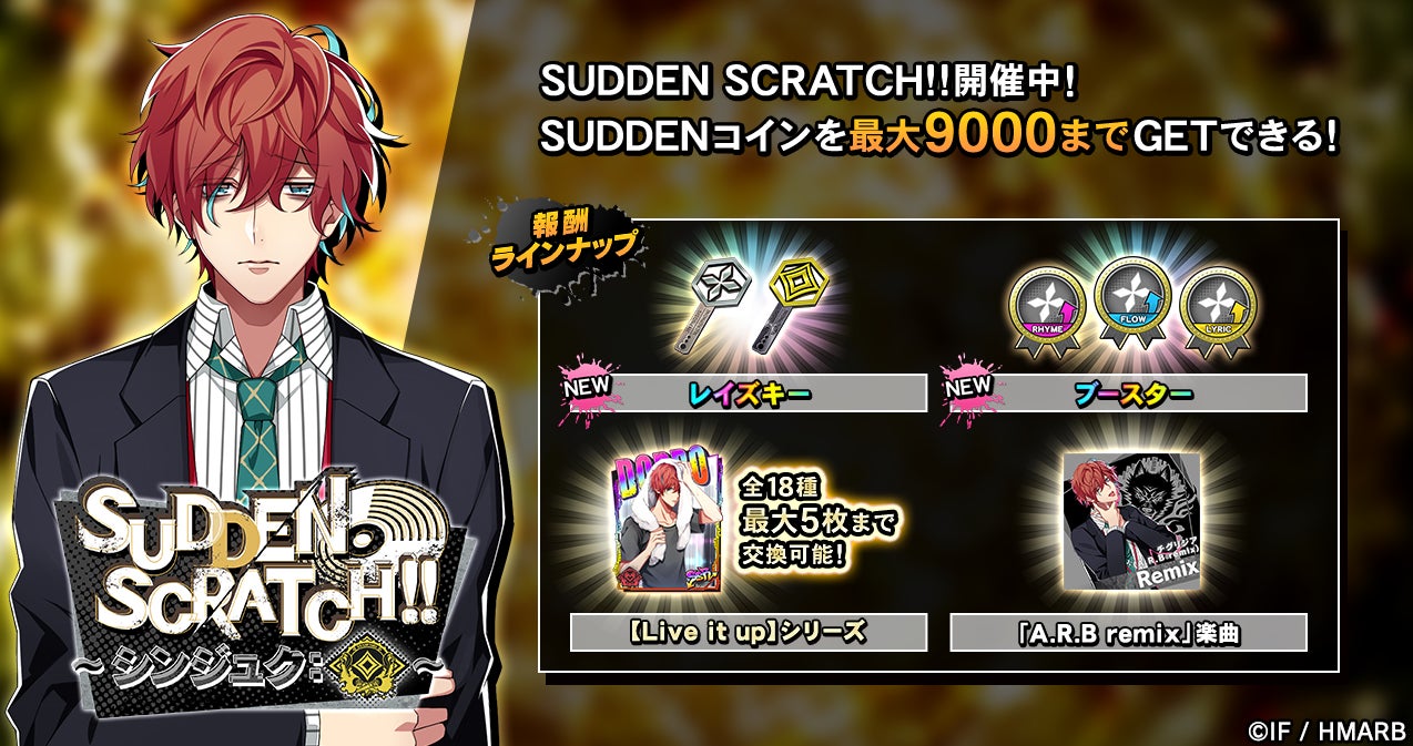 イベント期間中、KILLER SCRATCH!!をプレイするとライズ消費量に応じた確率でSUDDEN SCRATCH!!が発生します。SUDDEN SCRATCH!!をプレイすると、通常の報酬アイテムの他、限定アイテム「SUDDENコイン」を獲得することができます。「SUDDENコイン」を集めることで、レイズキーやシンジュク・ディビジョンのデコステッカーに使えるブースターなどと交換することが可能です。他にも、ストーリーカードの【Live it up】シリーズ、「A.R.B remix」楽曲などがラインナップされています。