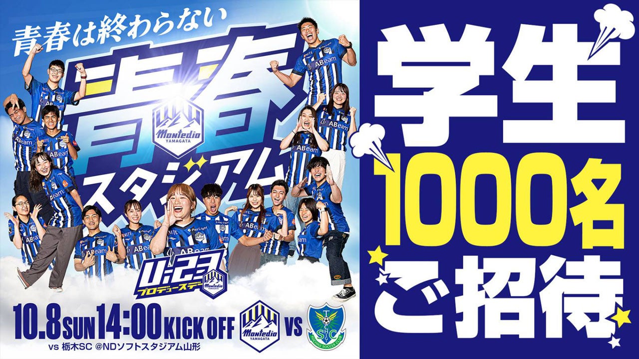 モンテディオ山形では、10月8日(日)栃木SC戦にて、高校、短期大学、専門学校、大学、大学院生を対象に『学生1,000人無料招待』を実施いたします。