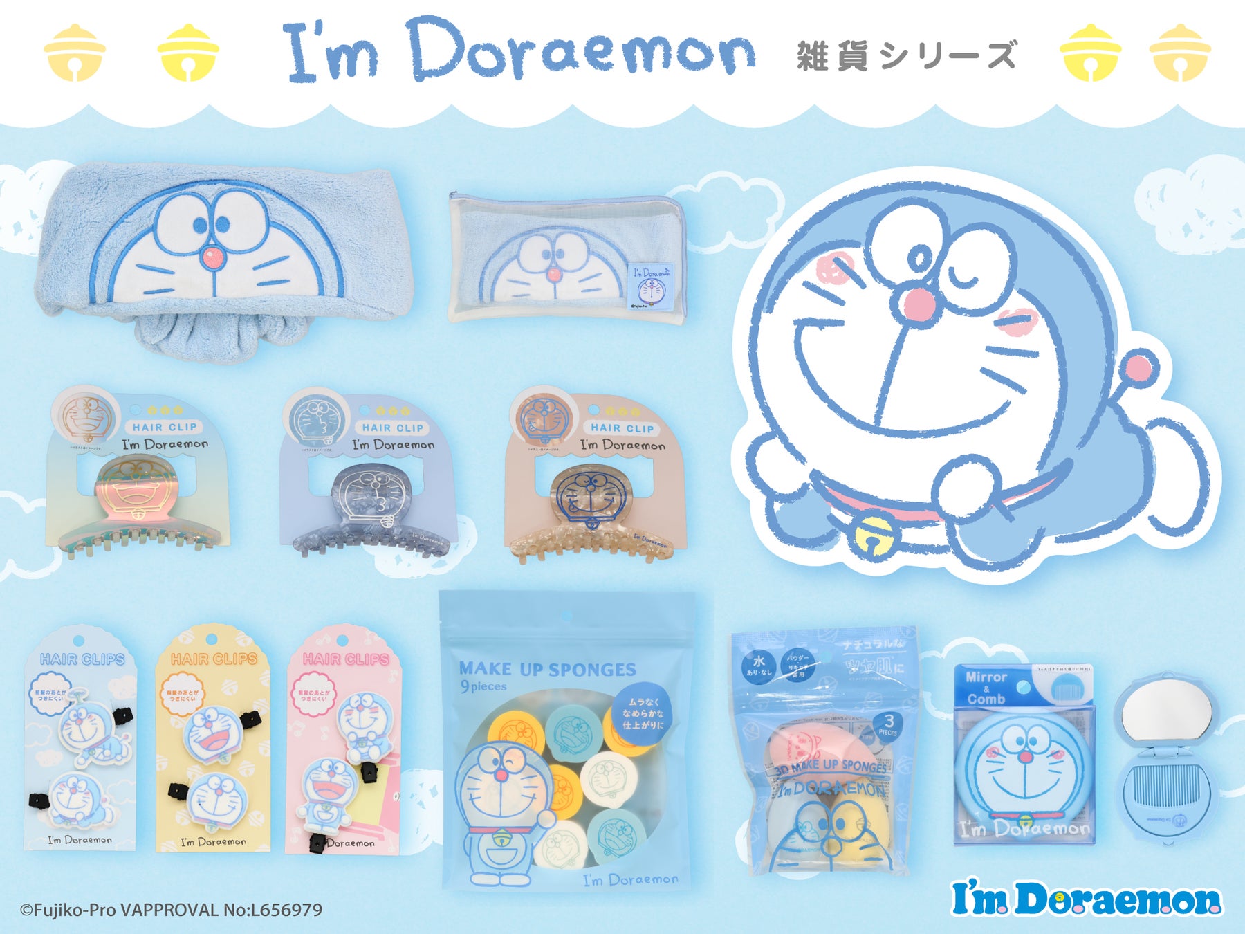 化粧品、化粧雑貨、服飾雑貨及びキャラクター雑貨等の企画・製造・販売、コンタクトレンズの企画・販売を行う粧美堂株式会社(本社:東京都港区、代表取締役社長:寺田正秀、以下 粧美堂)は、株式会社サンリオがデザインした「I’m Doraemon(アイムドラえもん)」シリーズより、雑貨シリーズを全国のドン・キホーテ系列店舗(一部店舗を除く)にて3月21日(金)より順次発売いたします。表情豊かなデザインのメイクアップスポンジやヘアクリップ、持ち運びに便利なミラー&コームなど、6種10アイテムのラインアップです。