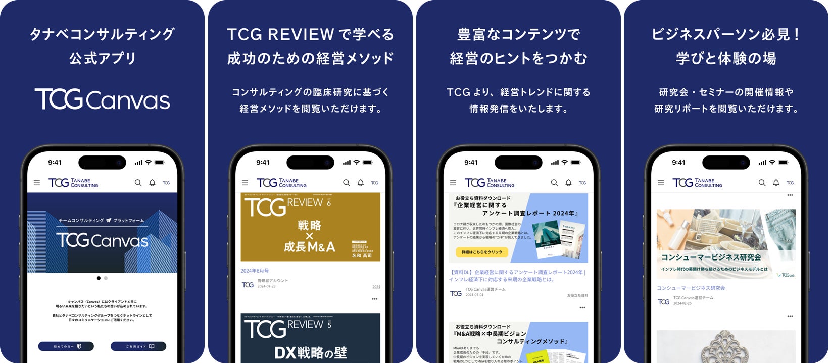 アプリ内では、タナベコンサルティングが毎月発行するビジネス情報誌『TCG REVIEW』の最新号・バックナンバーを無料で閲覧することが可能です。毎月テーマが変わる特集記事をはじめ、コンサルタントからの提言、有識者のコラムなど、毎日のビジネスに役立つ情報をお届けいたします。