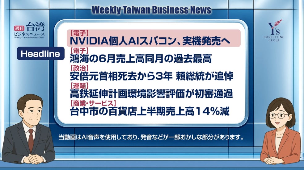 【週刊台湾ビジネスニュース】AIスパコン発売、鴻海売上高、安倍元首相追悼、台湾新幹線伸延、台中市百貨店【2025/07/14号】