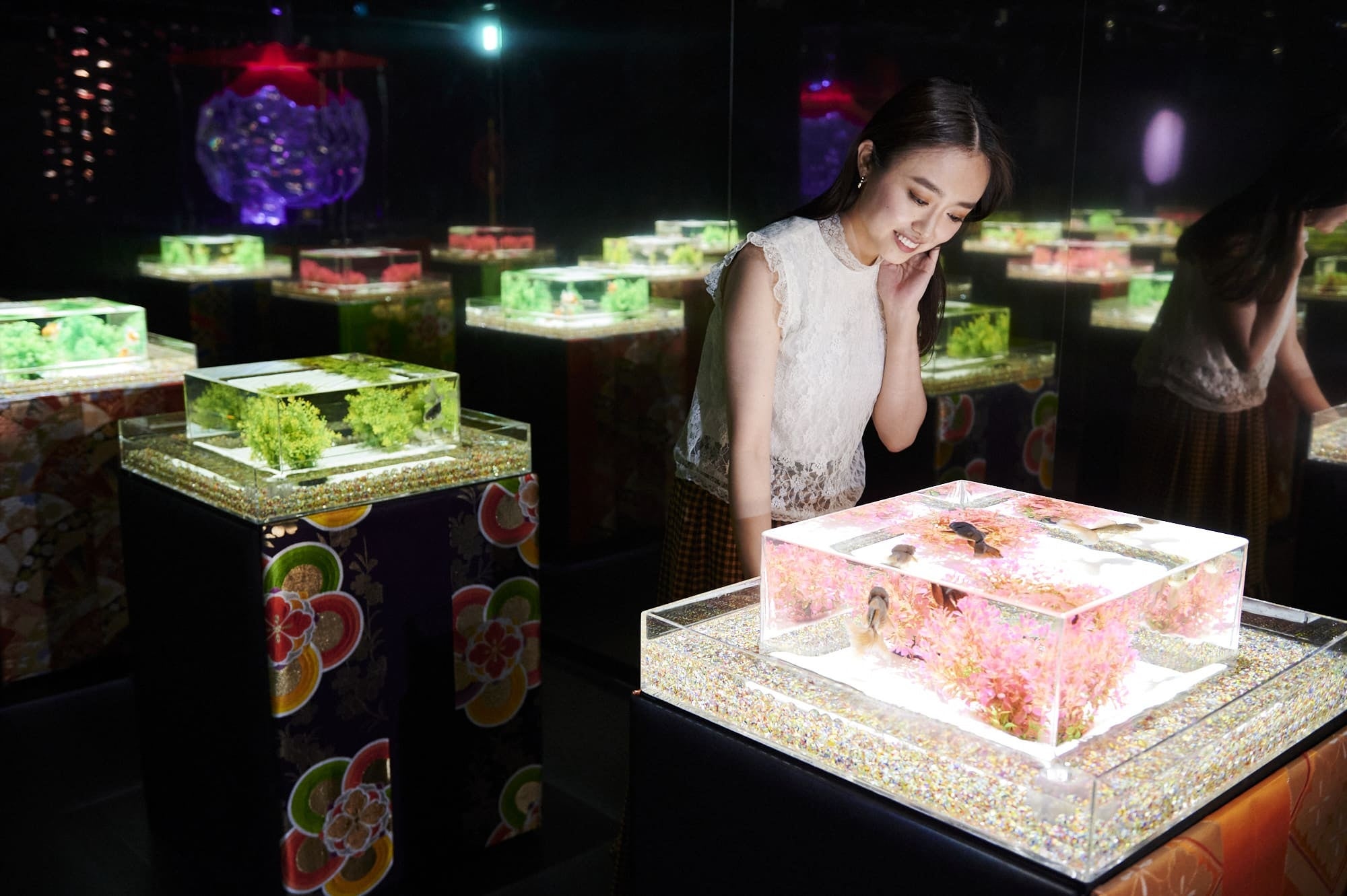 多彩な金魚たちが泳ぐ水槽作品を、光・音・香で演出するエンターテインメントアート“アートアクアリウム”。館内には、約70種類・およそ3,000匹の金魚が幻想空間のなかを泳いでいます。