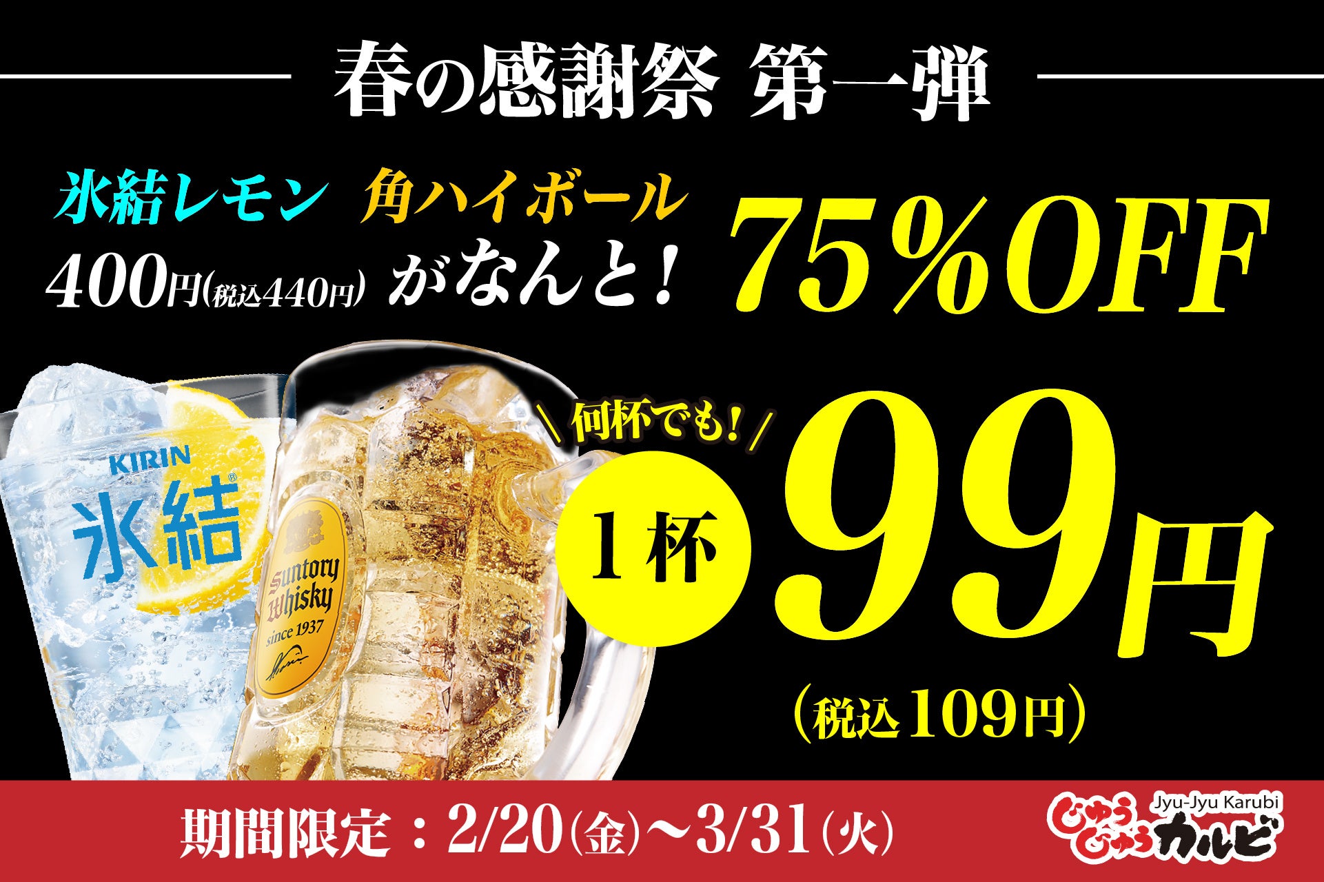 【75%OFF】何杯飲んでも、1杯99円(税込109円)氷結レモンサワー、角ハイボールが特別価格!焼肉食べ放題じゅうじゅうカルビで、春の感謝祭 第一弾を開催!