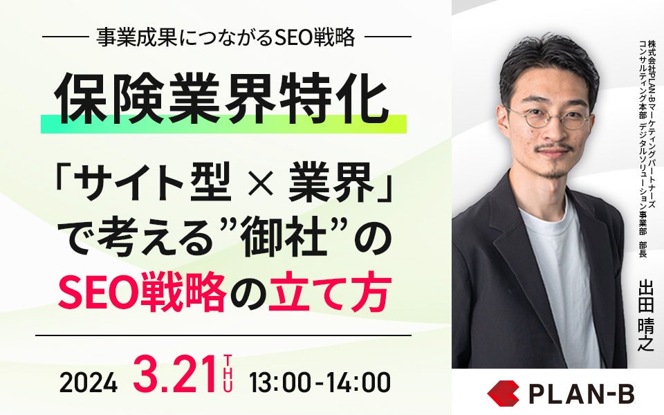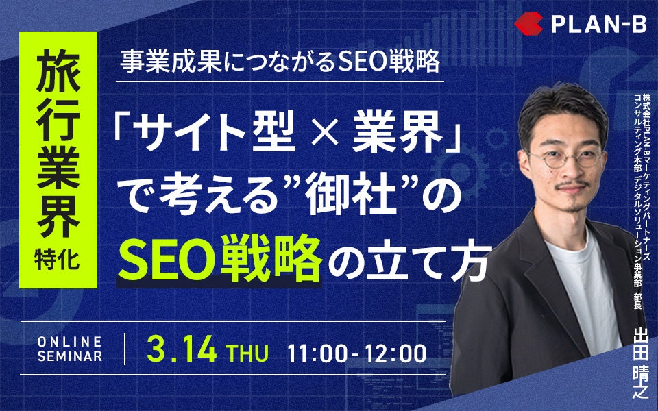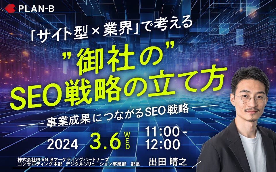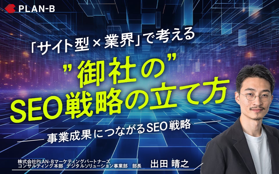 累計支援実績5,000社超のSEO事業を中心に、独自のデジタルマーケティング技術を駆使し、お客様のビジネス拡大を支援する株式会社PLAN-B(本社:東京都品川区、代表取締役:鳥居本真徳、以下当社)は、「事業成果につながるSEO戦略」をテーマに、無料Webセミナーを実施いたします。