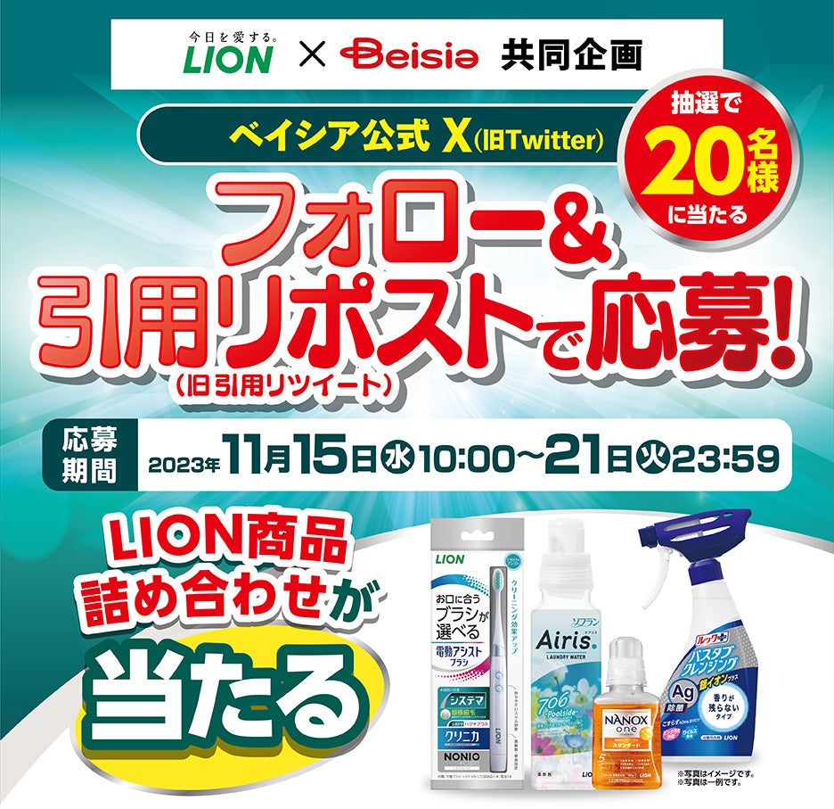 ベイシア公式X(旧:Twitter)をフォローし、指定のハッシュタグを付けて引用リポストをしていただいた方の中から抽選で20名様に「ライオン商品詰め合わせ」をプレゼントいたします。