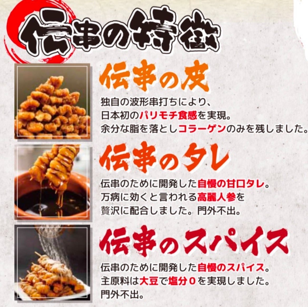 新時代名物揚げ皮串「伝串」の商品開発コンセプトは、「旨い」と「健康」。