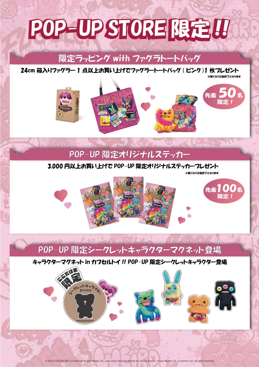 今回のポップアップストアでは柱や壁にファグラーたちが散りばめられ、写真撮影ができるスポットを多数設置します。ぬいぐるみが敷き詰められたファグラー壁、お買い上げされたファグラーを可愛く撮影できる背景ボードや小物を揃えたフォトブース等、お楽しみエリアも用意しています。