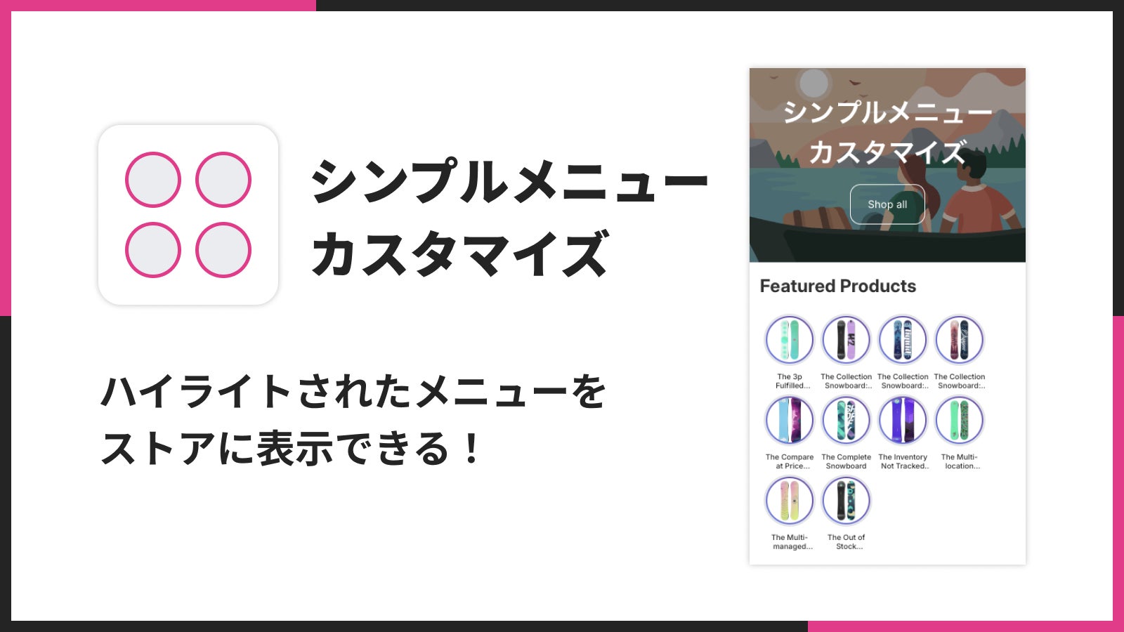 「シンプルメニューカスタマイズ|お手軽アイコンメニュー」は、ストア内のナビゲーションを強化するためのサークル型メニューを簡単に追加できる Shopify アプリです。