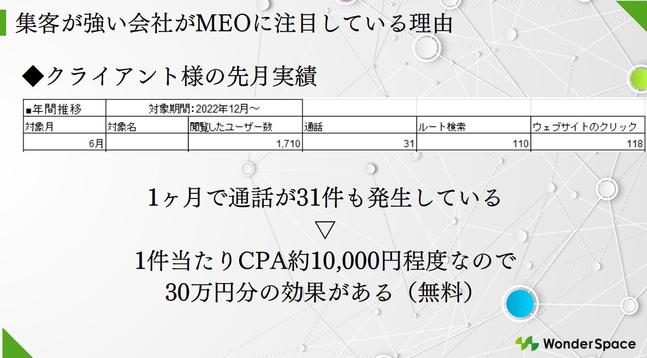 MEOの知名度の低さもあり、対策に着手できている事業者様も少なく、大きな機会損失になっている可能性があります。弊社クライアント様では、実際にGoogleマップから無料で月間30件のお問い合わせを獲得できた事例があります。