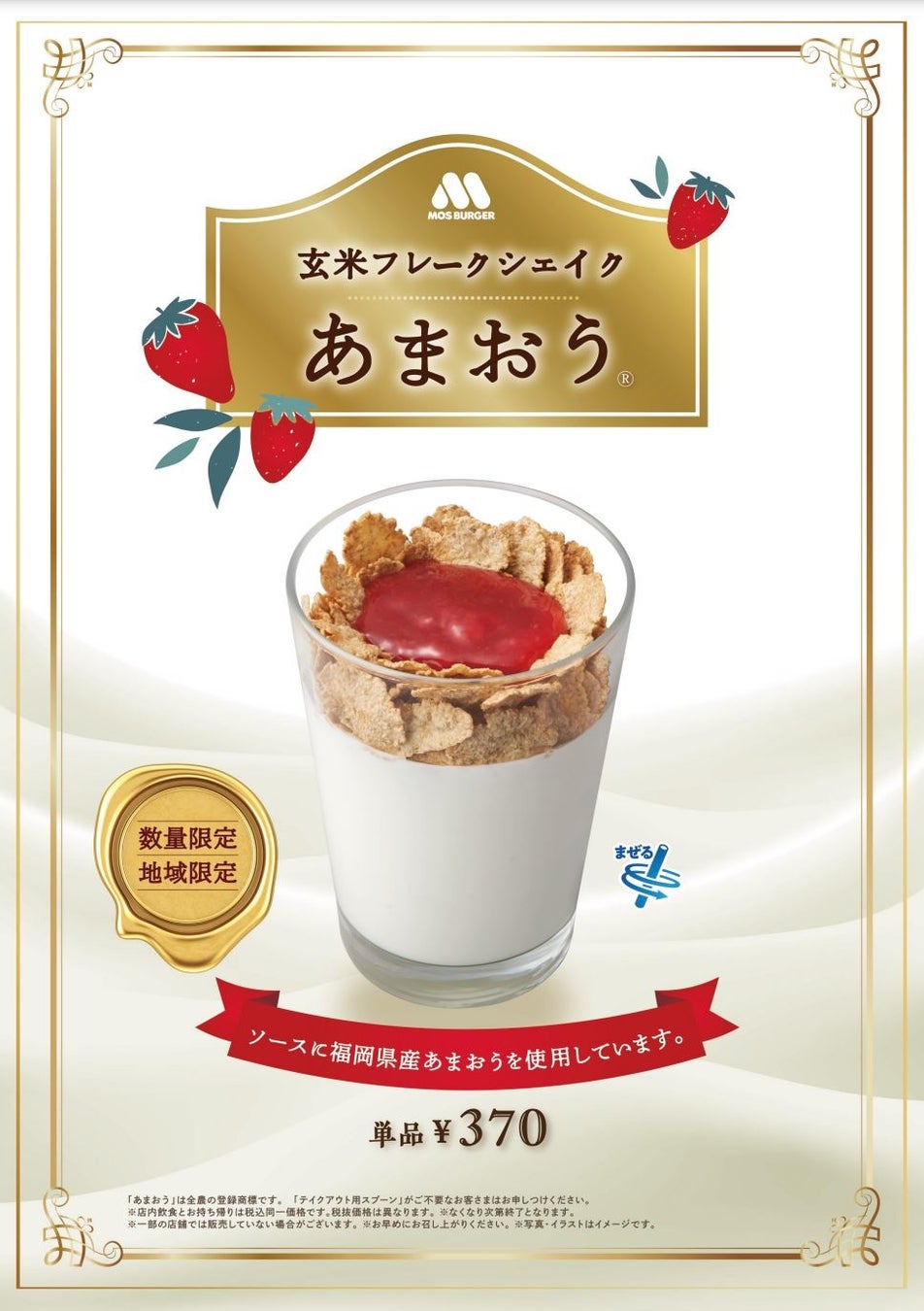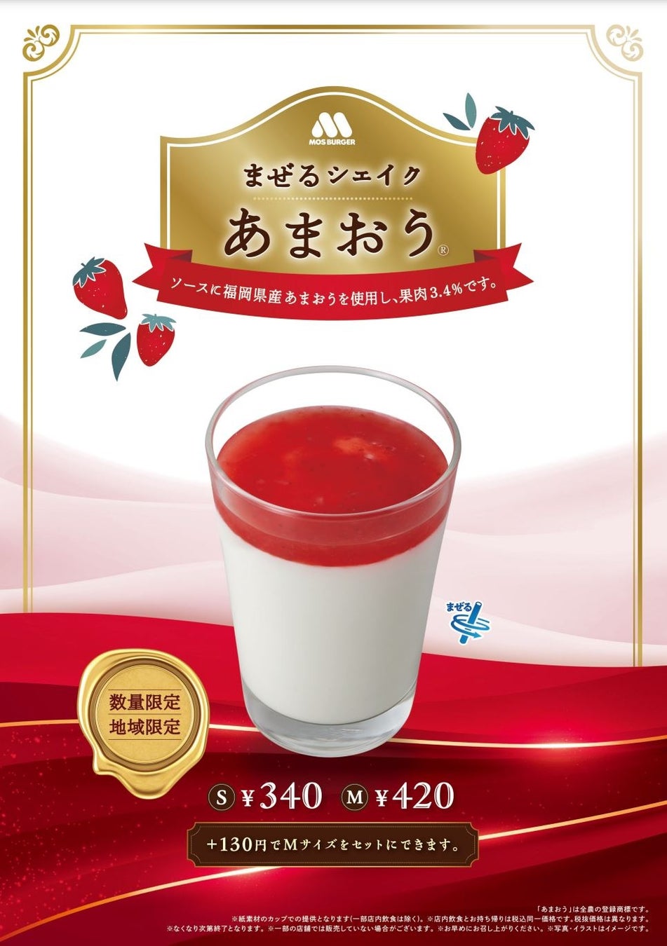 モスバーガーでは、日本で生まれたハンバーガーチェーンとして、日本各地の食材や特色を活かした全国一律ではない魅力ある商品づくりを行っております。今回は、高級いちごの代表格であり、福岡県でしか栽培されていないブランドいちご「あまおう🄬」を使用したシェイクを九州エリア及び沖縄県で販売します。地元の食材とコラボレーションしたシェイクを地域限定で販売することで、地元食材の魅力を改めて知っていただくとともに、地産地消を応援します。