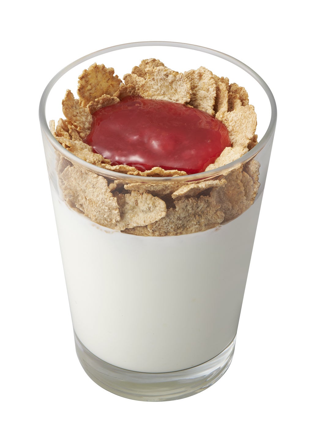 モスのバニラシェイクに、福岡県産「あまおう🄬」を使用したいちごソースを合わせ、玄米フレークを加えました。玄米フレークのサクサクとした食感がアクセントです。滑らかなバニラシェイクとよく混ぜてお召し上がりください。