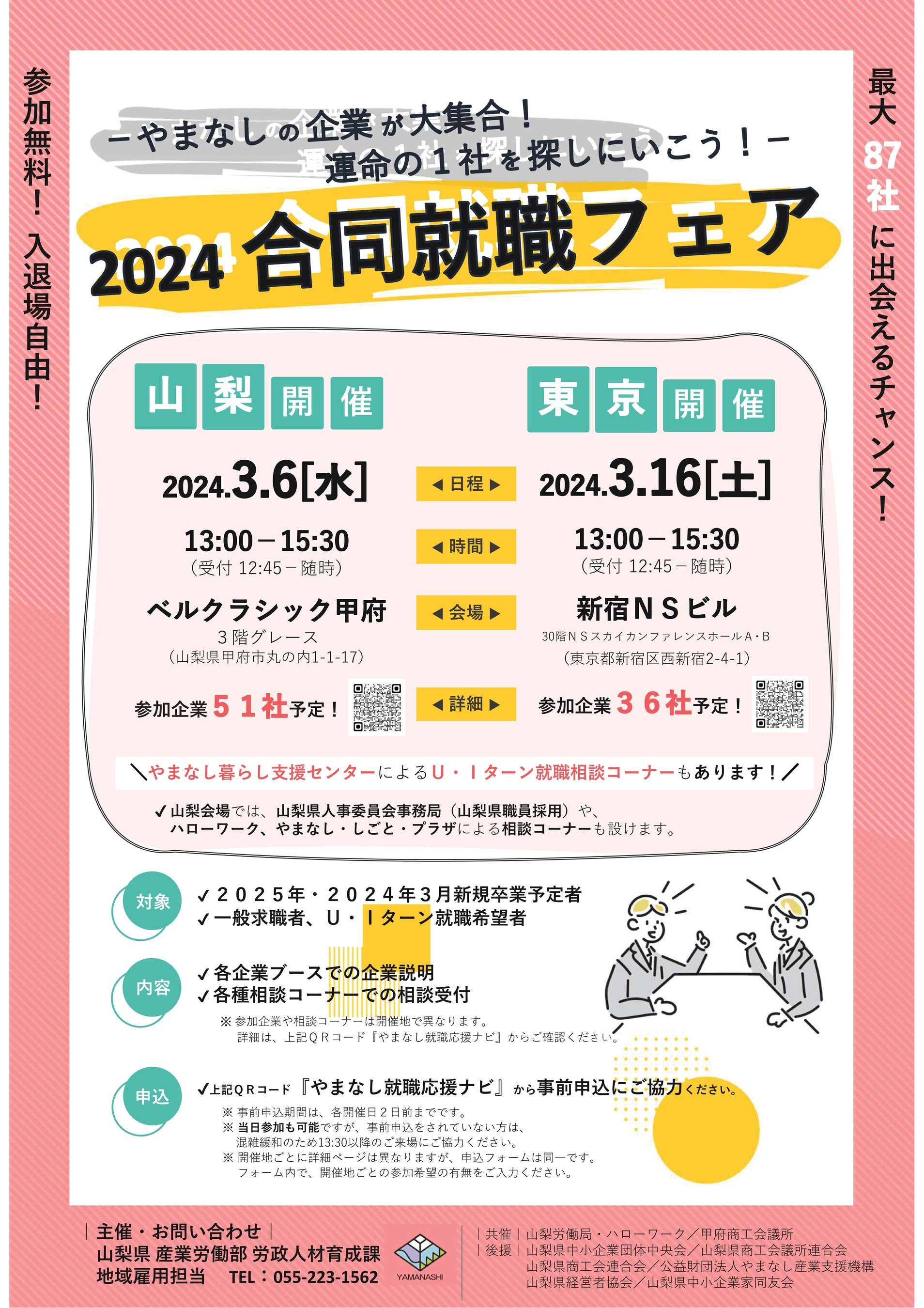 やまなしの企業が大集合!!山梨県主催「2024合同就職フェア」 山梨県内及び東京開催!