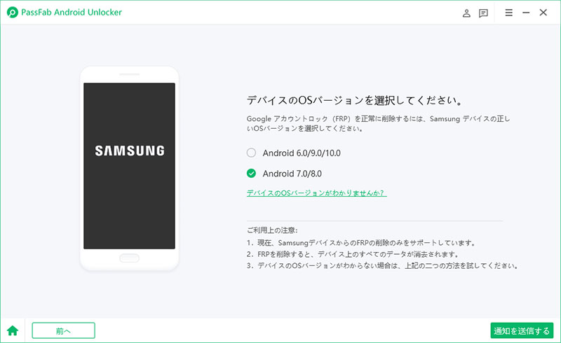 Step2:AndroidをPCに接続した後、OSバージョンを選択て「通知を送信する」をクリックします。