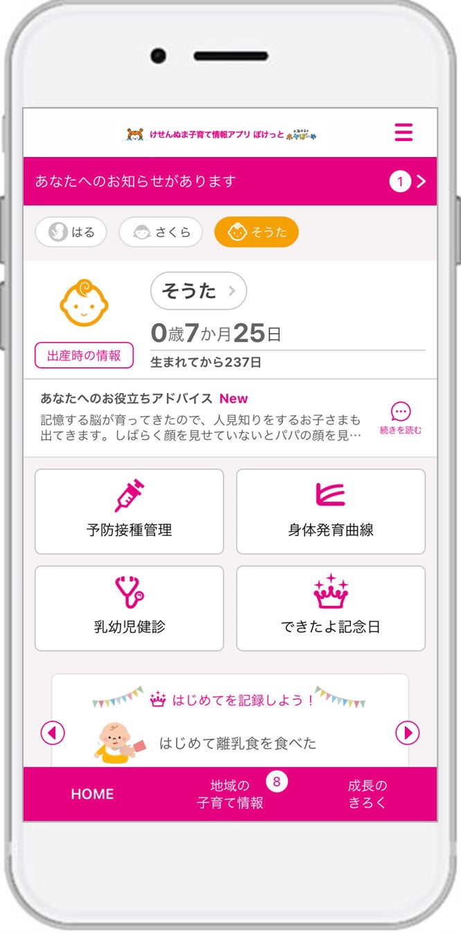 宮城県気仙沼市に採用された『けせんぬま子育て情報アプリ ぽけっと』は、スマートフォン・タブレット端末・PCに対応したサービスで、妊産婦と子どもの健康データの記録・管理や予防接種のスケジュール管理、出産・育児に関するアドバイスの提供、離れた地域に住む祖父母など家族との共有機能や、市が配信する地域の情報をお知らせするなど、育児や仕事に忙しい母親や父親を助けてくれる便利な機能が充実しています。