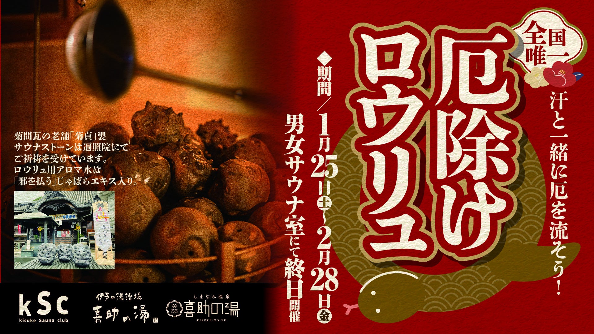 愛媛県の温浴施設「喜助の湯」では、2025年1月25日(土)~2月28日(金)まで、日本初(※自社調べ)の“サウナで厄除け”ができる「厄除けロウリュ」を開催します。この企画は、愛媛県今治市にある「やくよけ大師 遍照院」にて厄除け祈祷した菊間瓦製サウナストーン【鬼丸・鬼玉】をサウナストーブで熱し、じゃばらエキスを含んだアロマ水を【鬼丸・鬼玉】に掛けて蒸気を大量に発生させ(ロウリュ)、全身に浴びて厄払いを願うものです。今年度は蛇年も相まって、さらなる厄除け効果が期待できます。