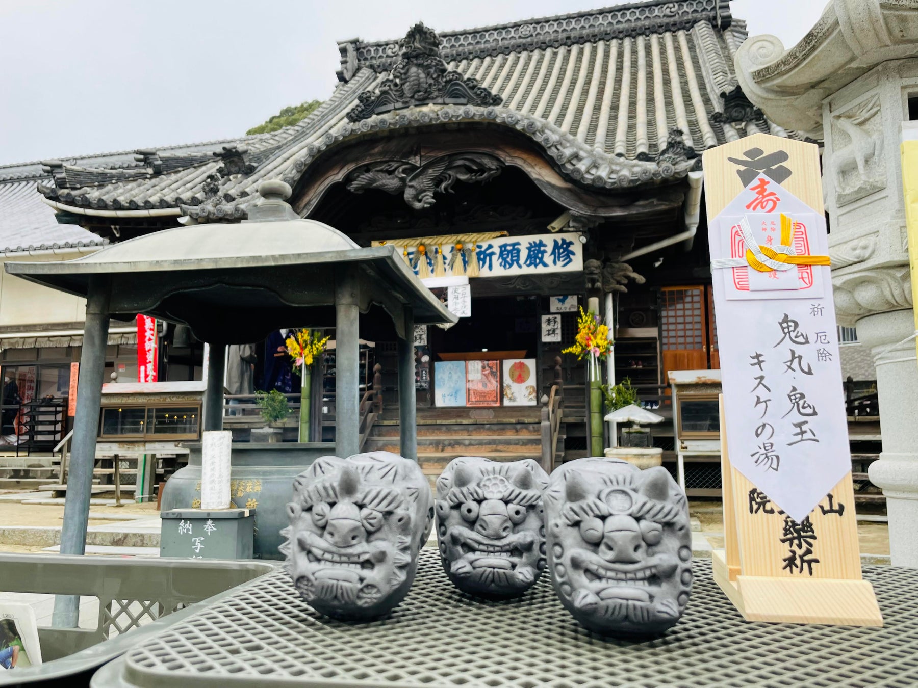 喜助の湯では、製造したサウナストーン「鬼丸」「鬼玉」の厄除け祈祷のため、愛媛県今治市菊間町に所在する寺院「やくよけ大師 遍照院」のご協力を得ました。遍照院は、四国八十八箇所番外札所、新四国曼荼羅霊場第42番札所として知られ、厄除大師の別名で親しまれています。弘法大師が42歳の時、自らの厄除けと末代緒人の厄除けのために開いたとされる遍照院は、毎年2月の「節分会厄除大祭」には、大勢の善男善女が、厄除祈願、諸願成就のために参詣します。