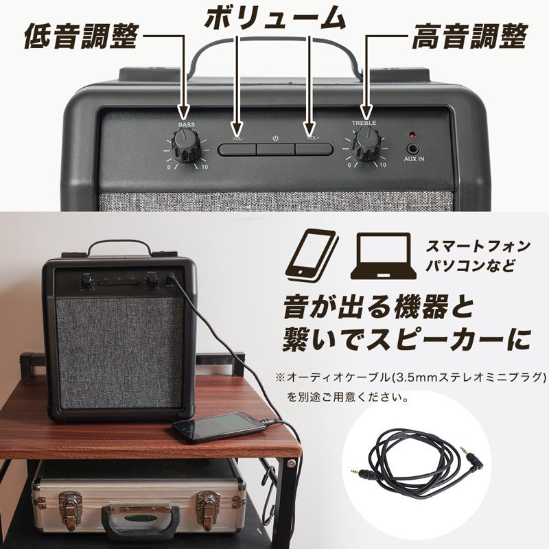本体前側のAUX入力端子にお手持ちのスマホやオーディオプレーヤーなどを接続するとスピーカーとしてもお使い可能。ボタンで音量の調整、ダイヤルで低音と高音の調整が可能です。