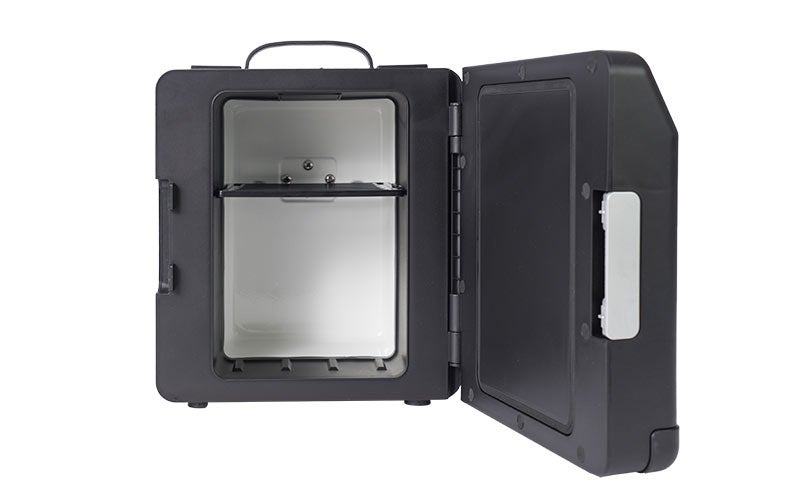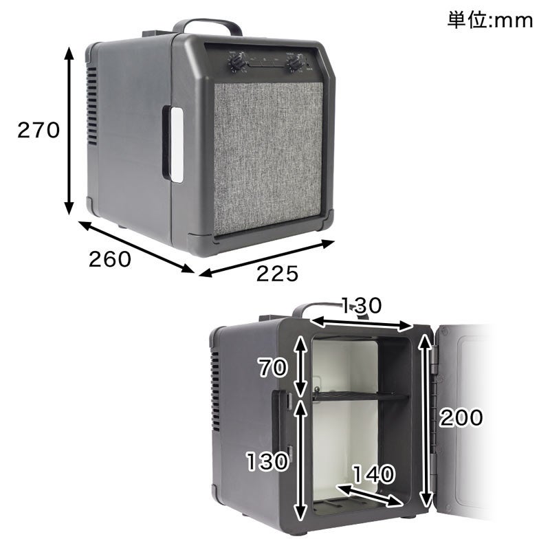本体サイズ幅225×奥行260×高さ270mm、重さ約2kg。家庭用コンセント及びシガーソケットから給電。庫内容量は4Lで350ml缶なら6本、500ml缶なら2本収納可能。