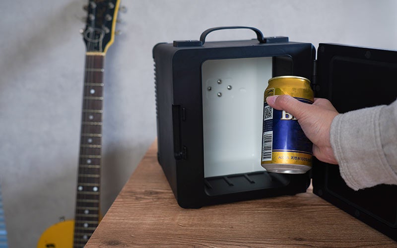 ギターが好き。オシャレなミニ冷蔵庫が欲しい。冷たい飲み物をいつでも飲みたい。車での外出時に車内で使える冷蔵庫が欲しい、そんな方におすすめの『スピーカー内蔵ギターアンプ型冷蔵庫』です。