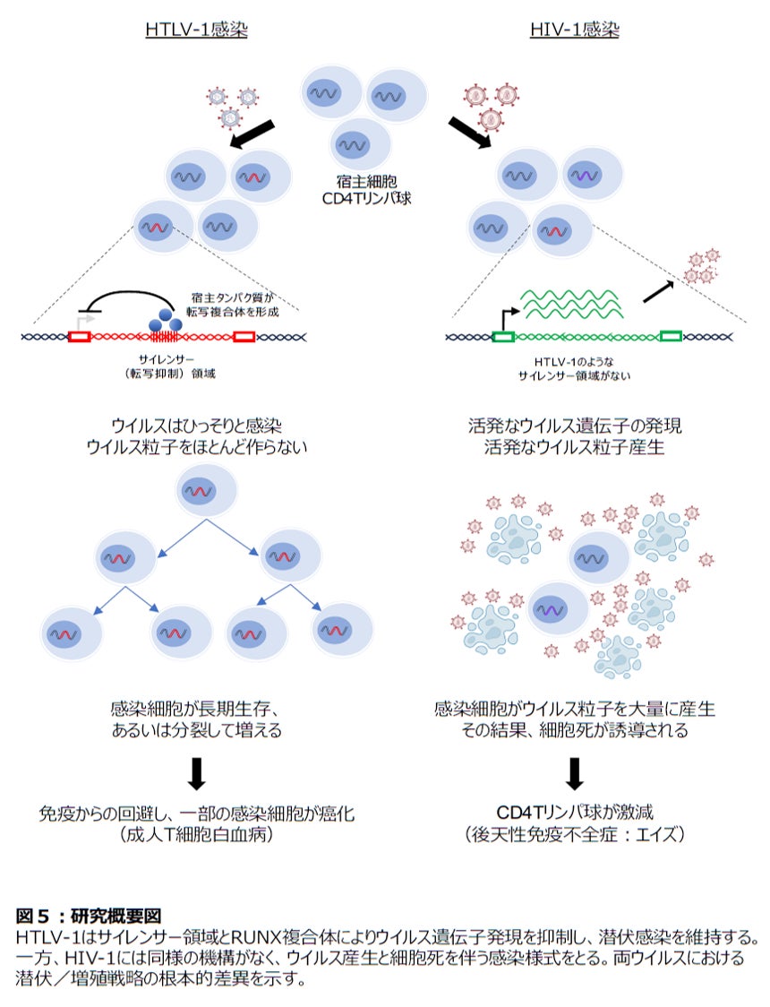 また、今回明らかにしたメカニズムは、ヒトレトロウイルスであるHTLV-1とHIV-1が、それぞれ潜伏感染および増殖感染という異なる感染経過をたどる主な要因であると考えられます。本知見は、ウイルスの進化過程および生存戦略を理解する上でも重要な新たな知見となります。(図5:研究概要図)。