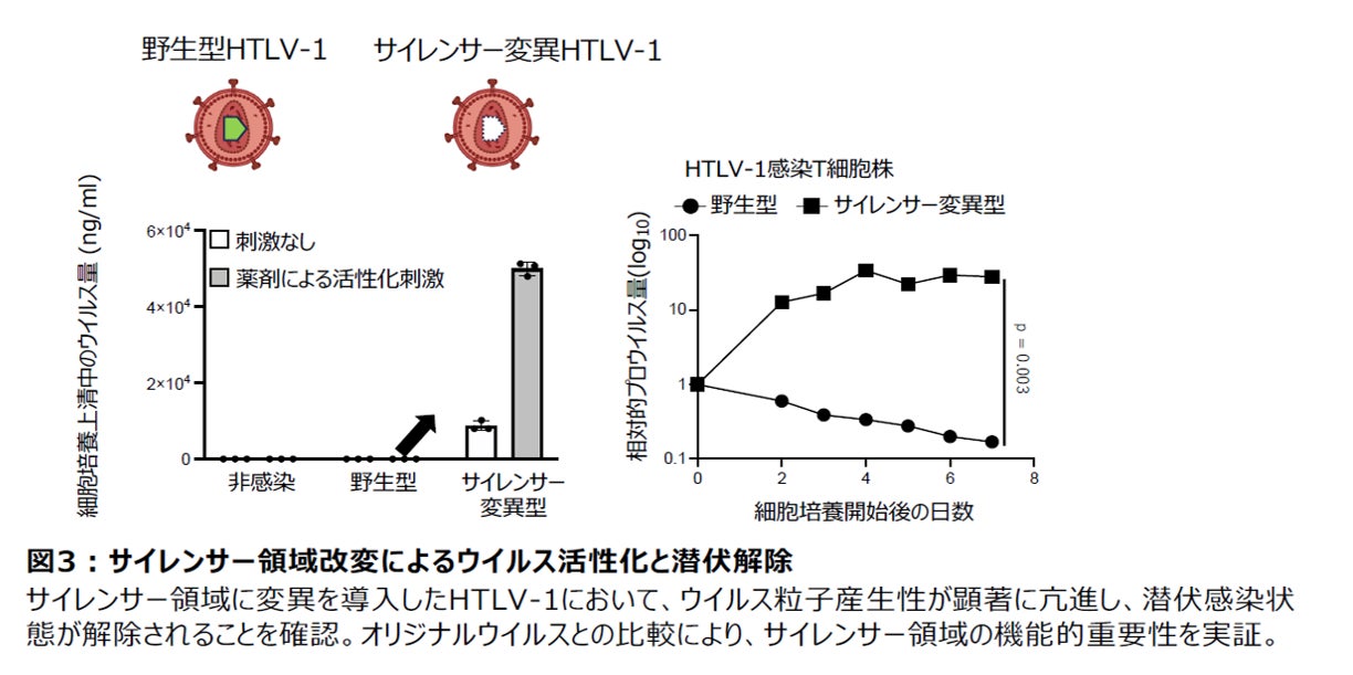 次に、同領域に変異を加えたウイルスを人為的に作成し、細胞に感染させる実験を行いました。その結果、変異HTLV-1はオリジナルウイルスに比べてウイルス粒子の産生性が増加しており、潜伏感染状態が阻止されたことが分かりました(図3)。