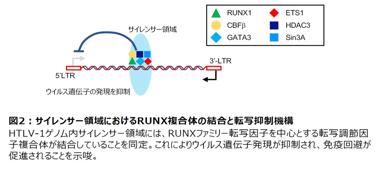 研究チームは、九州の医療機関と協力し、HTLV-1に実際に感染している患者さんの血液サンプルを用いて、感染細胞内でのプロウイルスの状態を「ATAC-Seq(アタックシーク)解析※5」という手法で詳しく調べました。その結果、ウイルスゲノムの中に、「クロマチン※6が開いた領域」が存在することを突き止めました(図1上)。さらにその領域の機能を調べたところ、同領域がウイルス遺伝子の転写を抑える機能を持つサイレンサー領域であることが確認されました (図1下)。同サイレンサー領域にはRUNX(ランクス)(Runt-related transcription factor) ※7を中心に様々な転写因子が複合体を形成することで、ウイルス遺伝子のスイッチを調節していることも分かりました(図2)。