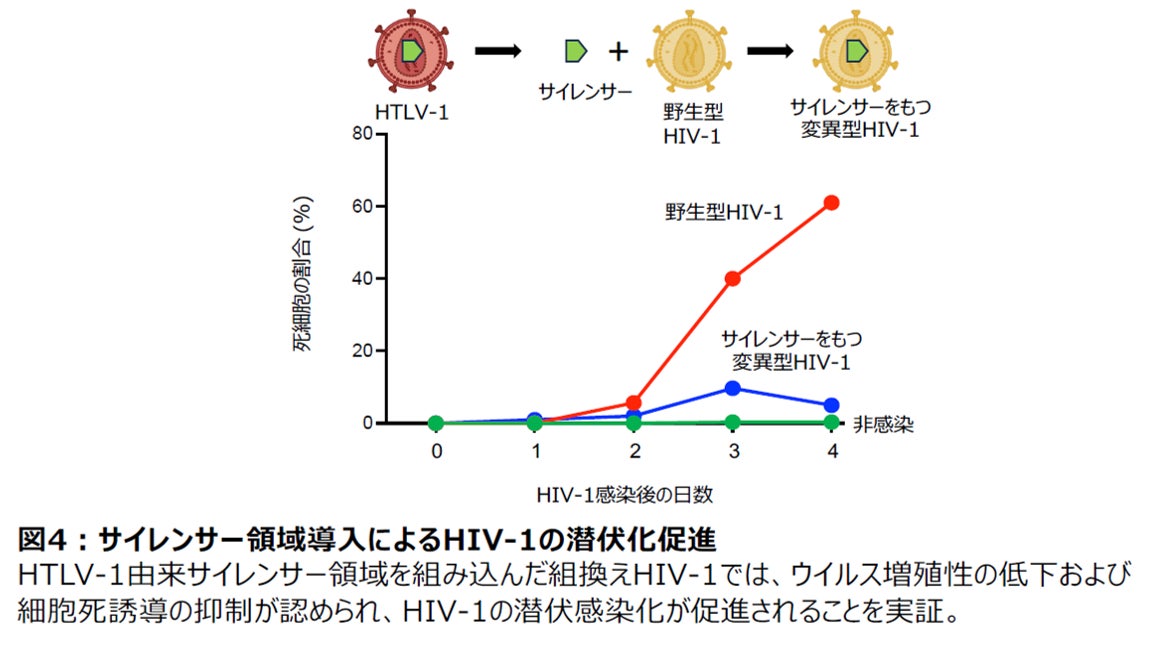 HTLV-1と同じレトロウイルスであり、ヒトに対して後天性免疫不全症候群(エイズ)の原因となるHIV-1は、感染CD4T陽性細胞でウイルス産生が盛んに行われ、感染細胞に細胞死を誘導した結果、エイズを引き起こすことで知られます。HIV-1のプロウイルスには今回発見されたサイレンサーに相当する領域がなかったことから、2つのレトロウイルスの感染様式を決定する重要な役割を持つことが考えられました。そのことを証明するために、サイレンサー領域を導入した組換えHIV-1を作成し、感染実験を行ったところ、ウイルスの増殖性が低下し細胞死誘導が顕著に阻害されたことから、HIV-1が潜伏感染するウイルスに変化したことが示唆されました(図4)。