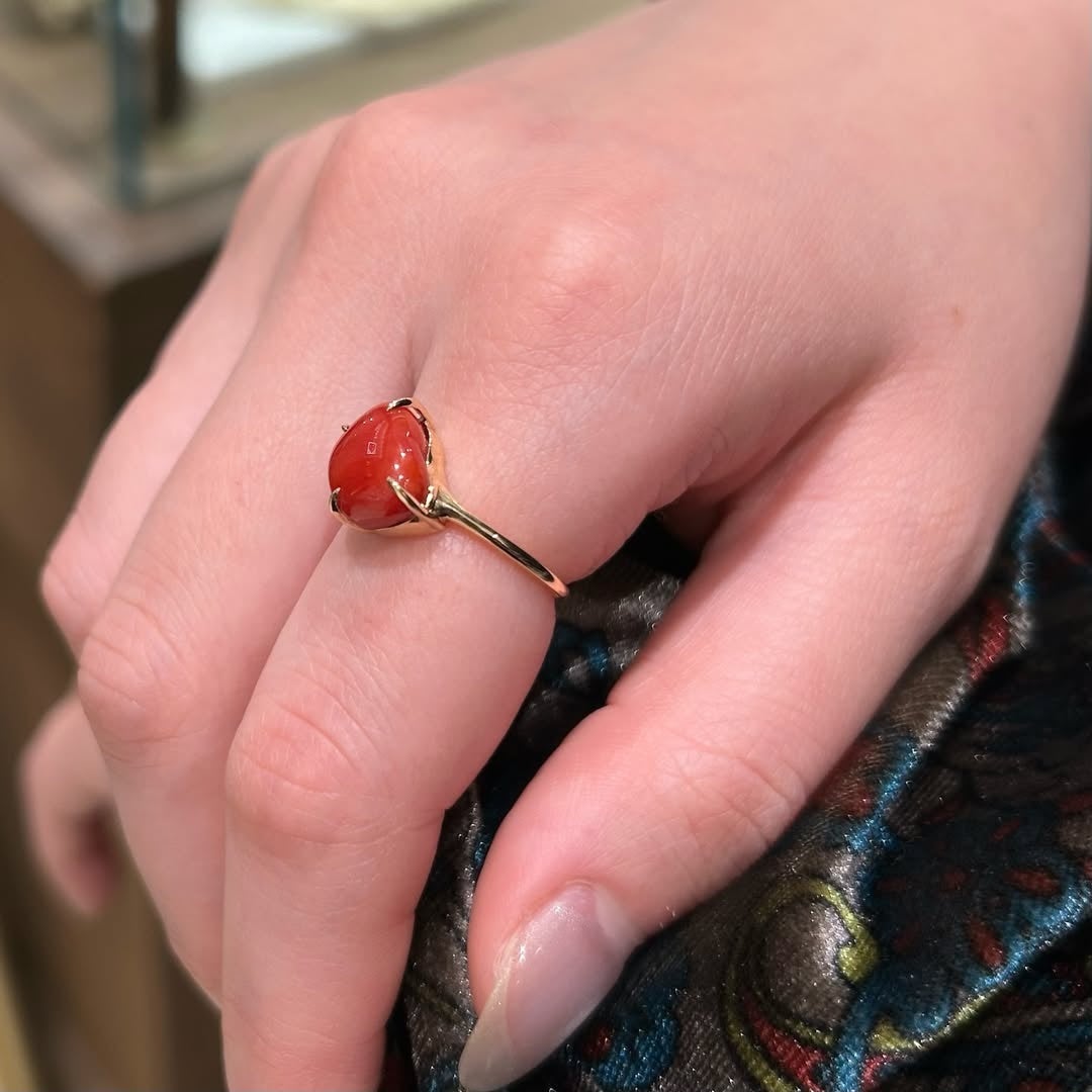 「LIBER Trad(リーベルトラッド)」は、サルジ珊瑚を主役に据えたリングです。濃度のある赤と、珊瑚そのものの形を活かした仕立てにより、素材の存在感が際立ちます。古くから幸福の象徴とされてきた珊瑚を、日常の装いに取り入れやすいかたちで表現しています。