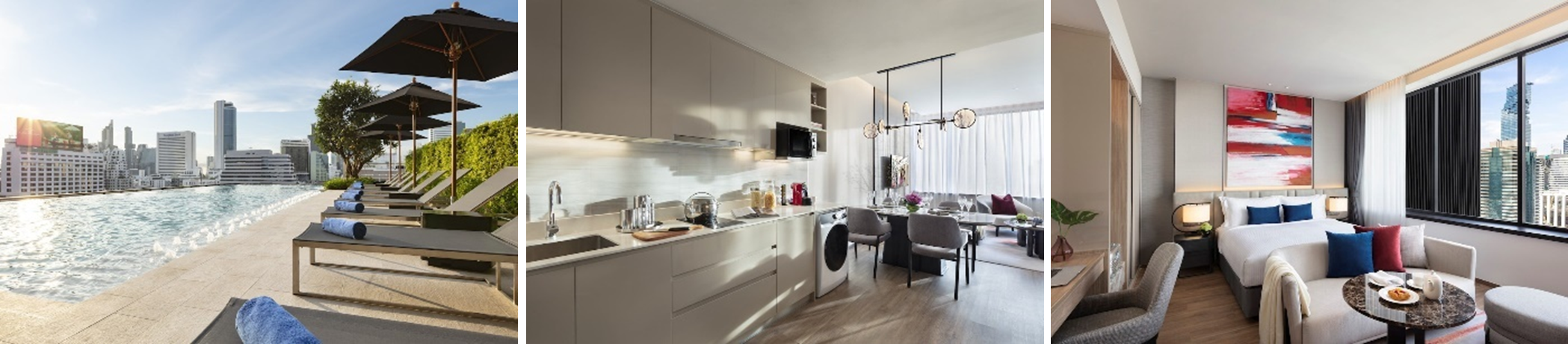 2022年9月にオープンした「アスコット エンバシー サトーン」はバンコク市内の商業エリアであるサトーンに位置し、市内の主要観光スポットに近く、観光にはもってこいの好立地です。ホテルには、サトーンの絶景シティビューを見渡せる屋外インフィニティプールがあるほか、各客室にはキッチン、リビングやダイニングルームエリア、最先端の電子機器やワークスペースなどの設備があり、長期滞在にもおすすめです。