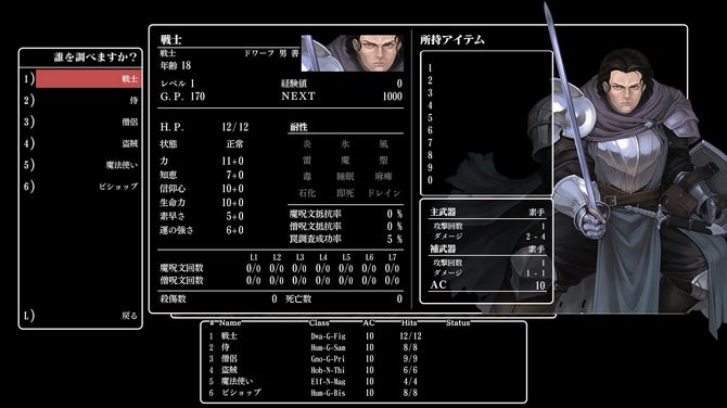 『Wizardry外伝 五つの試練』は、ゲームボーイで展開された『ウィザードリィ外伝』シリーズの流れを汲むゲームで、「拠点で6人の冒険者パーティを作り、ダンジョンに潜り敵との戦闘や様々な罠を潜り抜けながらアイテムを集めてキャラクターを成長させ、迷宮の奥深くを目指す」という、ゲームとしてはシンプルかつクラシックなタイプのRPGです。