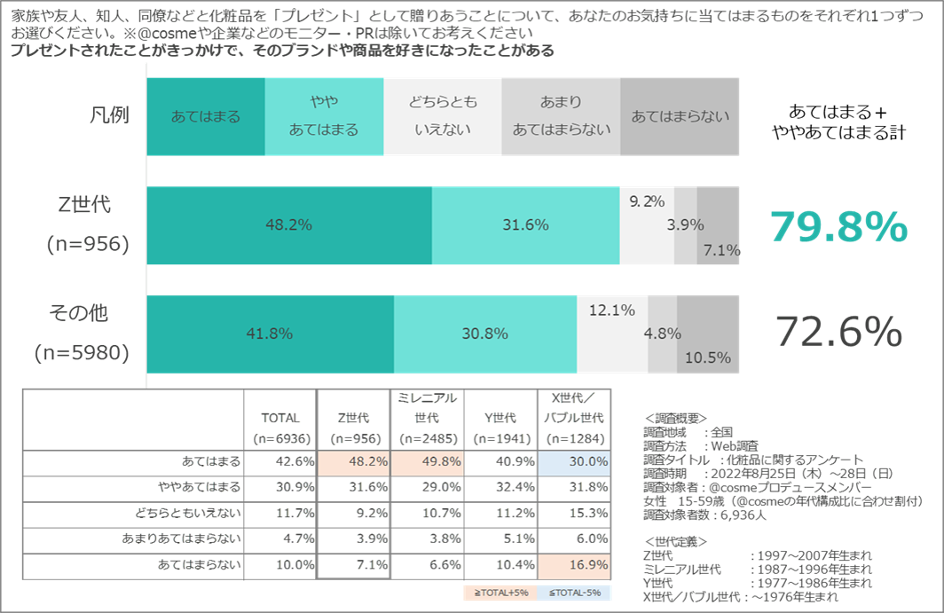 普段買わない/買えないような高額な化粧品は、プレゼントとしてもらったときはうれしくても、その後自ら購入しないことも考えられますが、リピート購入に繋がるケースも見られました。特にZ世代においては、「プレゼントされたことがきっかけで、そのブランドや商品を好きになったことがある」という質問への回答が他世代よりも7ポイント上回っています。