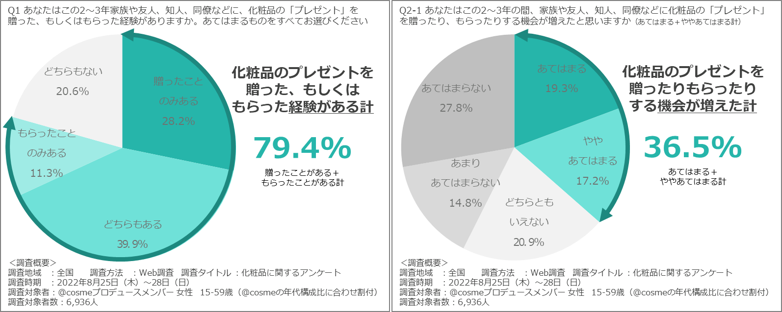 「あなたはこの2〜3年家族や友人、知人、同僚などに、化粧品のプレゼントを贈った、もしくはもらった経験がありますか」と聴取したところ、全体の約79%がいずれかの経験があると回答。さらに約37%が「この2〜3年の間で化粧品のプレゼントを贈ったりもらったりする機会が増えたと思う」と回答しました。@cosmeのクチコミにおいても、「プレゼント」というワードの出現率はコロナ前の1.3倍に増加しています(※)。