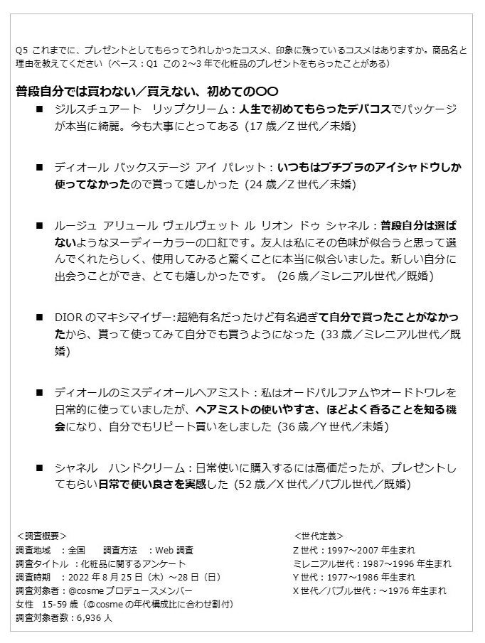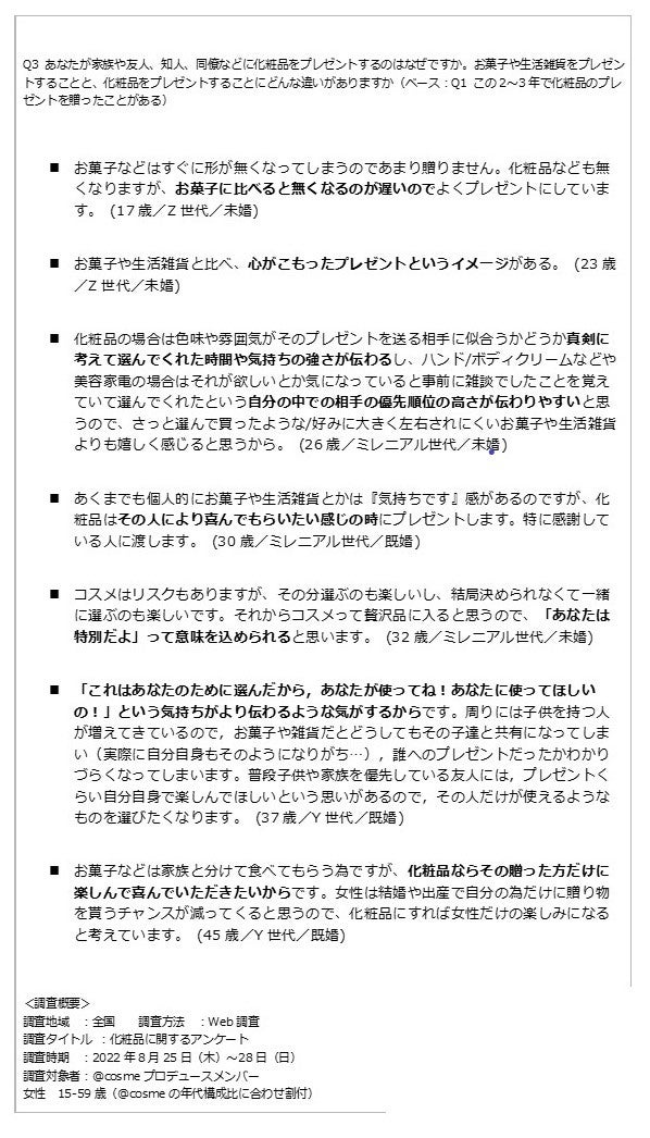 「もらってうれしかったコスメ」には世代の違いが見られましたが、化粧品プレゼントに込められた気持ちに世代の違いはないようです。「あなたが家族や友人、知人、同僚などに化粧品をプレゼントするのはなぜですか。お菓子や生活雑貨をプレゼントすることと、化粧品をプレゼントすることにどんな違いがありますか」と質問したところ、このような回答が寄せられました。