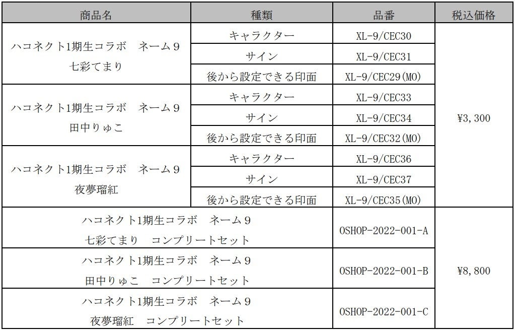 メンバー自身が選んだカラーパーツを組み合わせた特別デザインのネーム9で、ホルダー部にはメンバーのフルネームが印刷されています。今回、1個ご購入ごとに描きおろしイラストがデザインされた認定証とスマホ待ち受けをプレゼント。さらにコンプリートセットのご購入でシチュエーションボイスもプレゼントいたします。ネーム9は、描きおろしイラストがデザインされたオリジナルボックスに入れてお届けします。商品発送は3月上旬以降を予定しています。