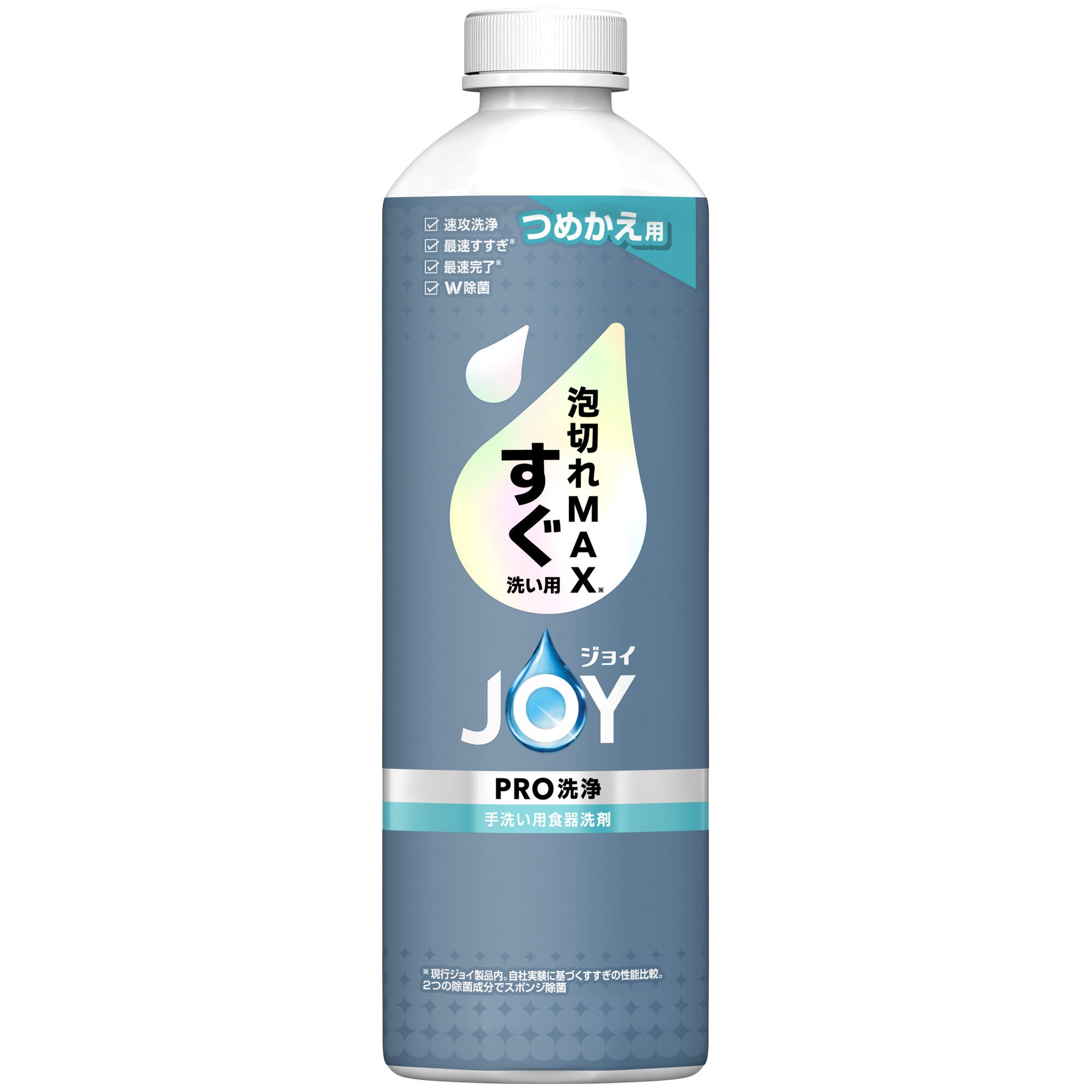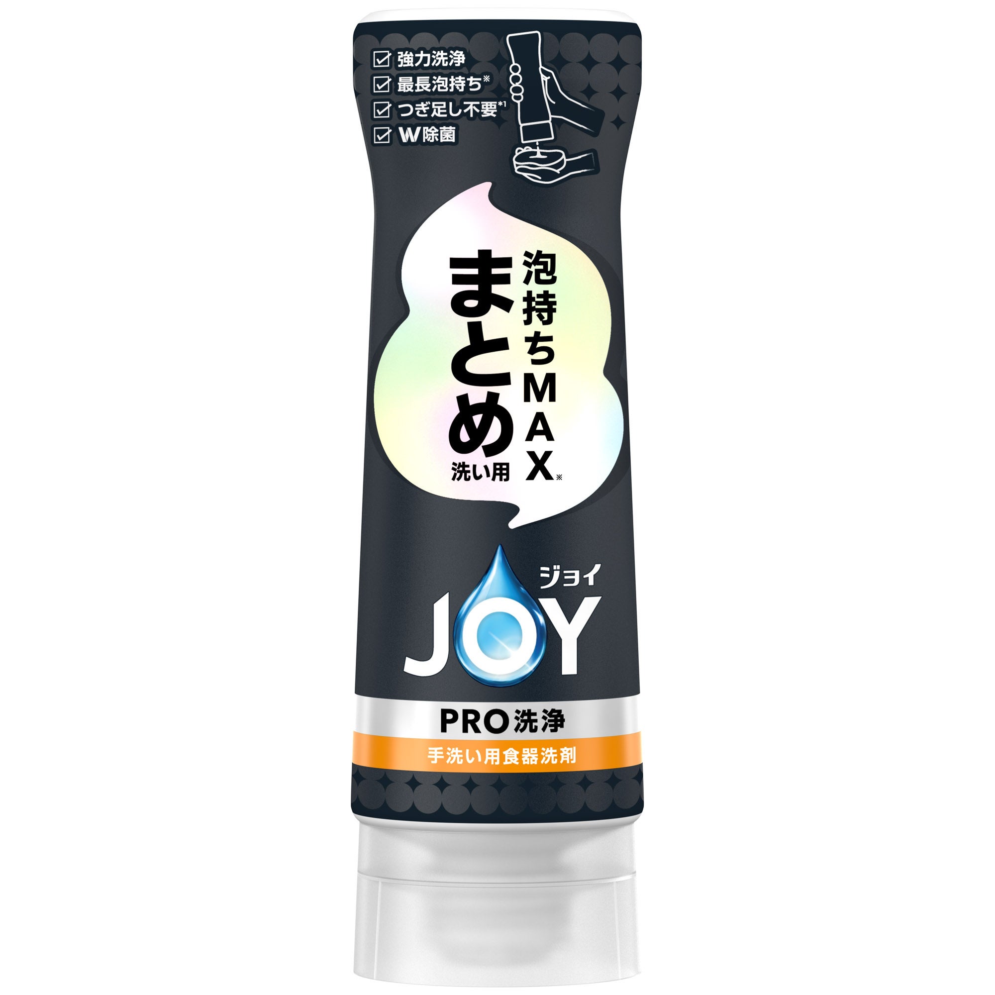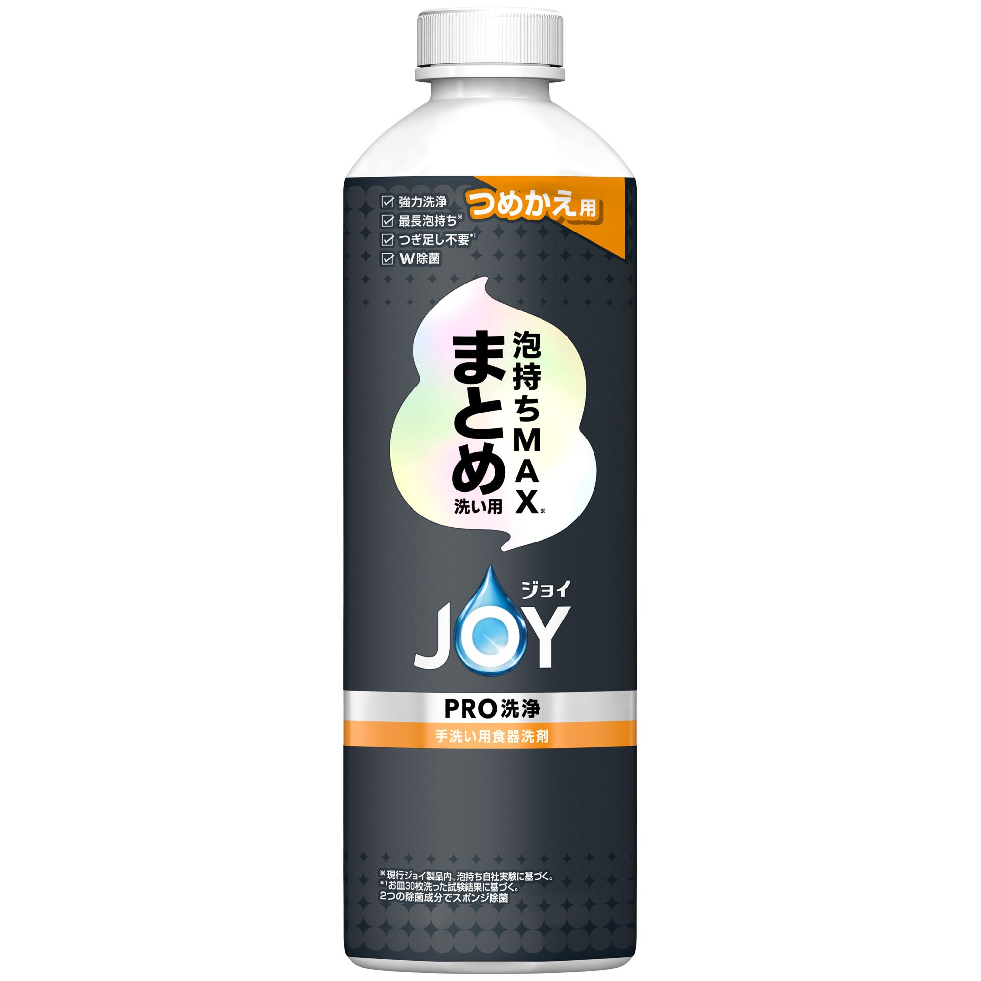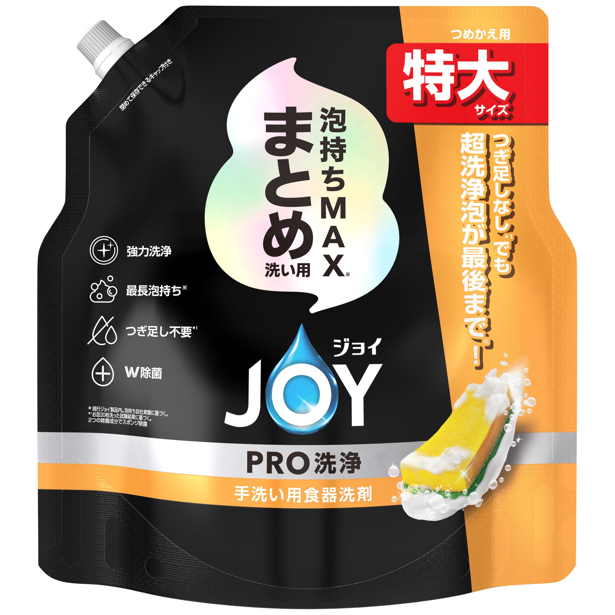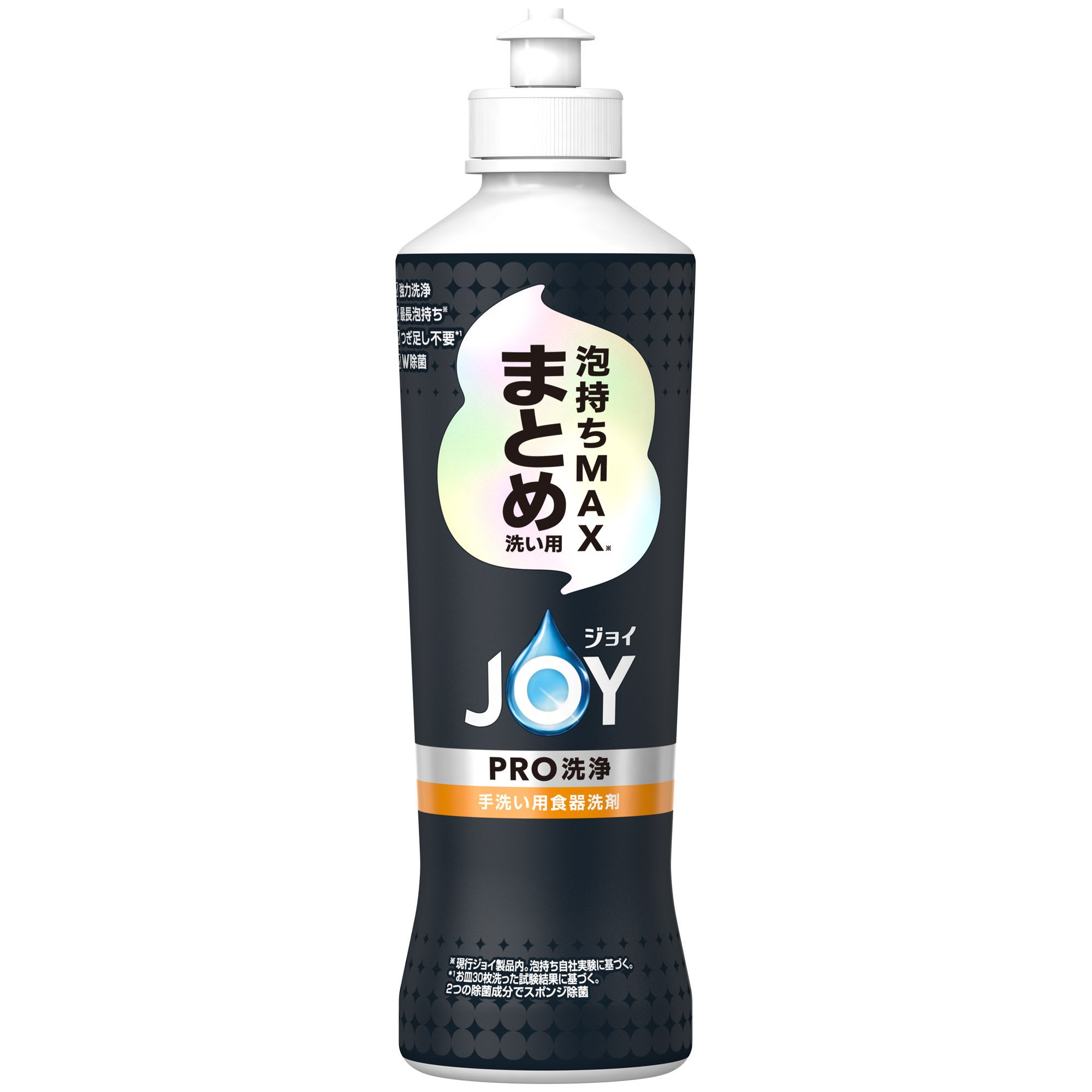 「ジョイPRO洗浄 まとめ洗い用」は、洗剤のつぎ足しをせずに一気に洗いたいというニーズに対応し、”泡持ちの良さ”を追求した製品です。頑固な油汚れにもヘタりにくい「泡持ちMAX※4テクノロジー」により、現行ジョイ製品内で最長の泡持ち※4を実現しました。1プッシュで30枚のお皿が洗える※1高い洗浄力と持続力により、つぎ足しなし※1での洗浄を可能にします。