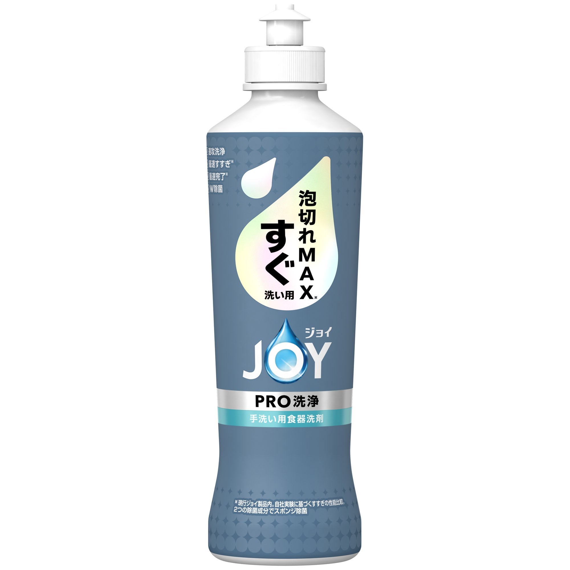 「ジョイPRO洗浄 すぐ洗い用」の「泡切れMAX※4テクノロジー」は、洗剤に含まれるすすぎ補助剤の割合を増やすことで、ぬるつきの原因となる物質が水とともに流れやすくなり、すすぎ時間を約半分※2に短縮します。