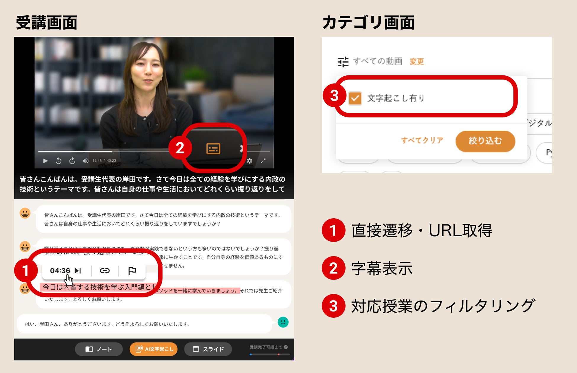 スクリプトは授業動画のタイムラインと連動しており、スクリプトの文字をクリックすると、該当する動画の再生位置に移動します。また、スクリプトからその再生位置の動画URLを取得することもでき、他者との共有も可能です。(画像の❶参照)