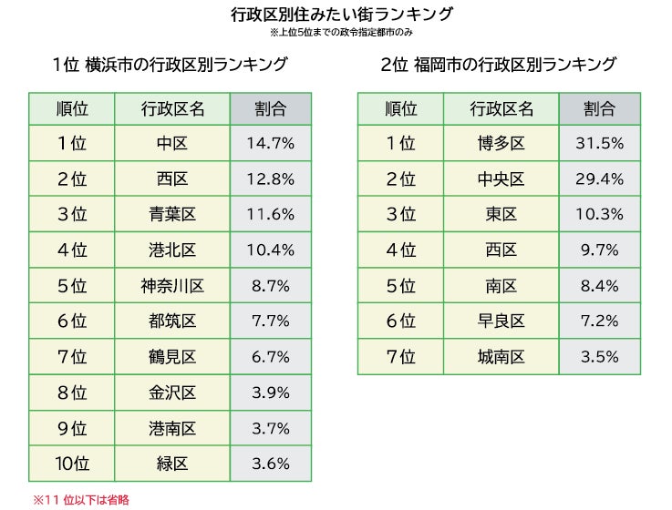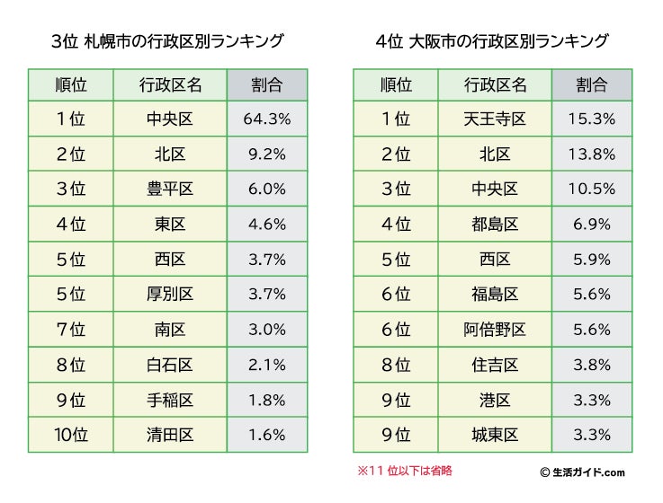 今回はさらに3年ぶりに上位の政令指定都市の中で、行政区の順位と割合を算出してみました。横浜市は複数の区に人気が分散している一方で、札幌市は中央区に、福岡市は中央区と博多区に、大阪市は天王寺区と北区、そして中央区に集中しているなど、特徴のある結果となりました。生活ガイド.comでは2024年2月に行政区ページを公開(https://www.seikatsu-guide.com/news/20240209.html)するなど、都道府県や特別区を含む市区情報だけでなく、政令指定都市における行政区の街情報も提供しております。