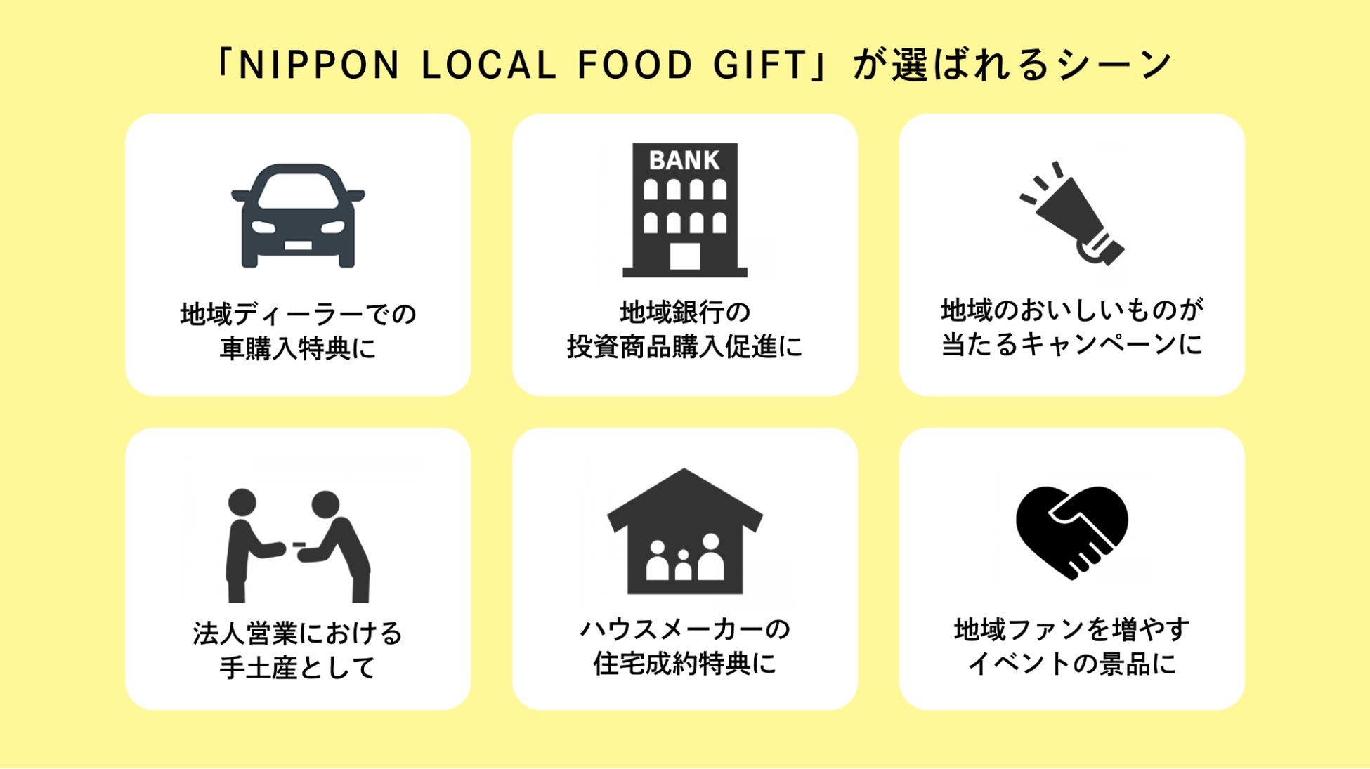 BtoCの顧客向けキャンペーン景品や法人営業での手土産、地域振興プロジェクトなど。地場産品をギフトとして届けることで、地域生産者の流通支援に直結する仕組みとなり、地域に根差した企業さまをはじめ、多様なシーンで選ばれています。