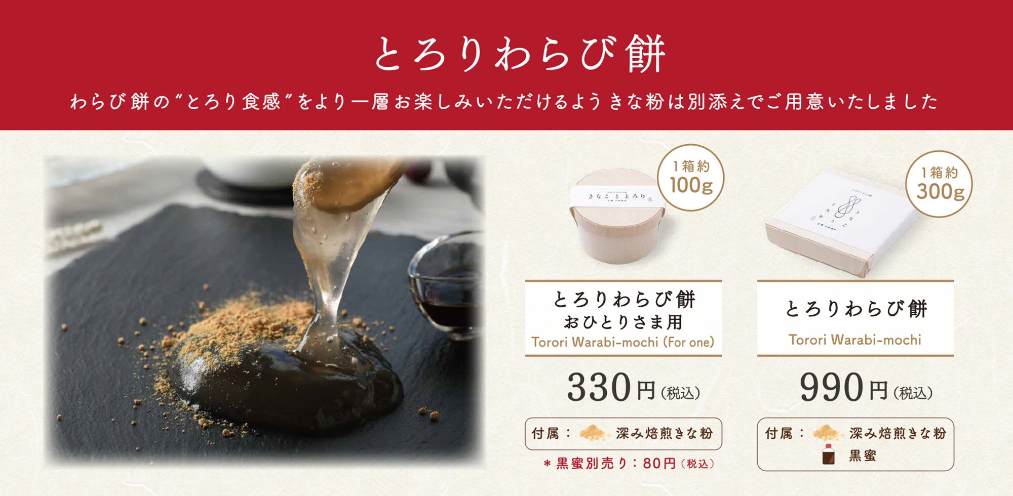 基本の深みきな粉-ミヤギシロメ-から、日本の四季折々の素材を使用した季節のわらび餅まで、「きょうもあしたも、京のわらび。」と、毎日お楽しみいただけるような商品をご用意しております。
