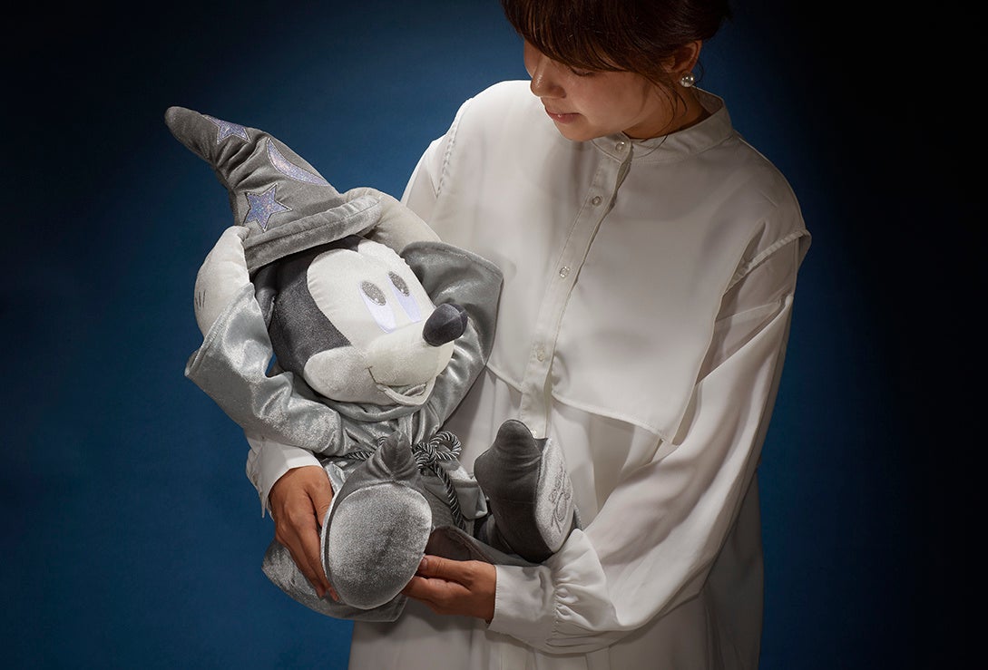 ディズニーの長編アニメーション映画の中でも傑作として語り継がれている「ファンタジア」のシーンより、魔法使いの帽子をこっそりかぶったミッキーを立体化したぬいぐるみで、視線が上を向いているミッキーのいたずら心が垣間見えるような表情を再現しています。立体化される機会の少ない貴重なこのミッキーを、ディズニー100周年のコンセプトカラーであるプラチナでデザインしました。