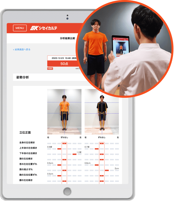 AI身体分析テクノロジーと接客DX技術を強みとする株式会社Sapeetが開発・運営する、最先端の画像解析技術(AI技術)を用いた姿勢分析システム。数枚の写真撮影のみでカラダの状態を詳細分析します。前後左右のゆがみ数値を自動測定し、一目でわかるようグラフ化。O脚、Ⅹ脚、ストレートネックなどのカラダの状態も文章でわかりやすく説明します。また、ゆがみの原因部位と将来の姿勢リスクを3Dアバターで可視化するなど、姿勢に関するさまざまな気づきを与え、改善エクササイズの提案をします。