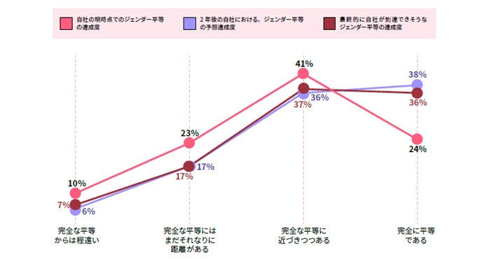 世界的に、半分以上の職種で、ジェンダー平等の取り組みが順調に進んでいるとは言えないことが明らかになりました。調査に回答した企業の3分の1が、ダイバーシティ、公平性、インクルージョン、帰属意識(DEIB)の取り組みはあるが、目標に対して進捗が遅い、またはほとんど進捗がないと答えています。