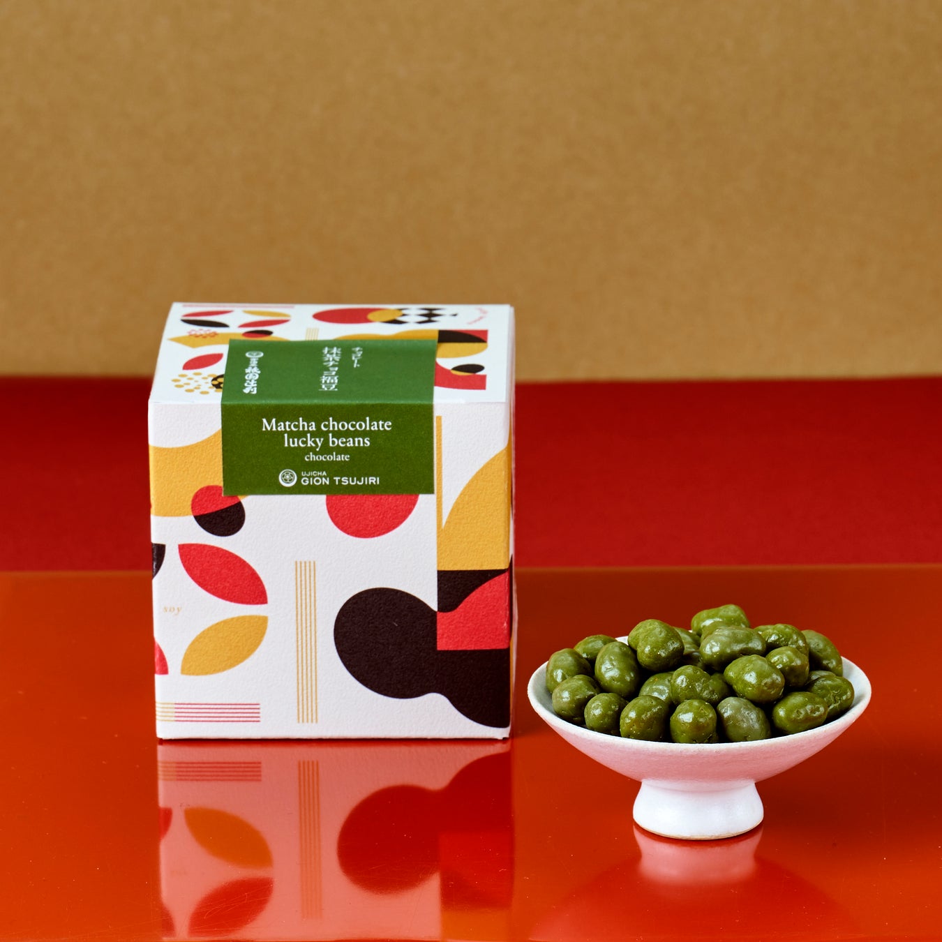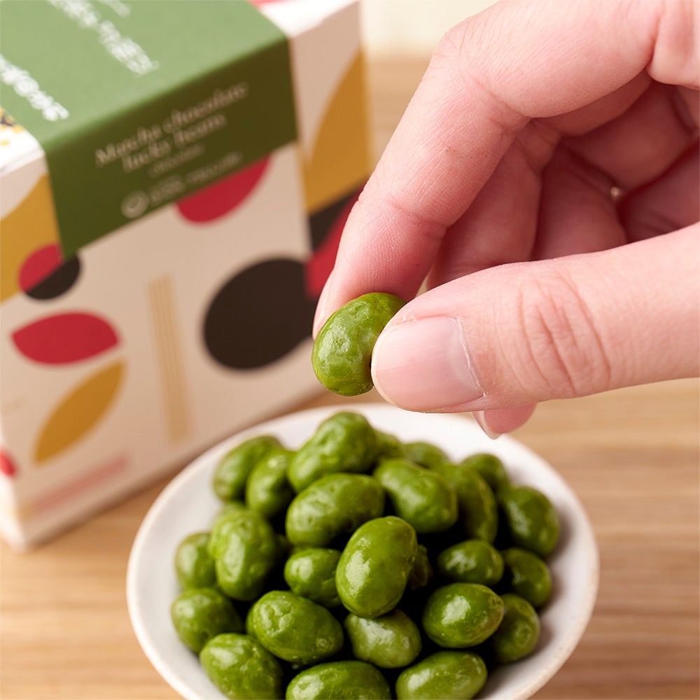 お茶を通して人々の健やかな毎日を願う祇園辻利では、福を招く豆菓子に宇治抹茶を組み合わせることで、皆様の幸せがより一層重なるよう想いを込めて、商品名は「抹茶チョコ福豆」、価格は税込八八八円といたしました。