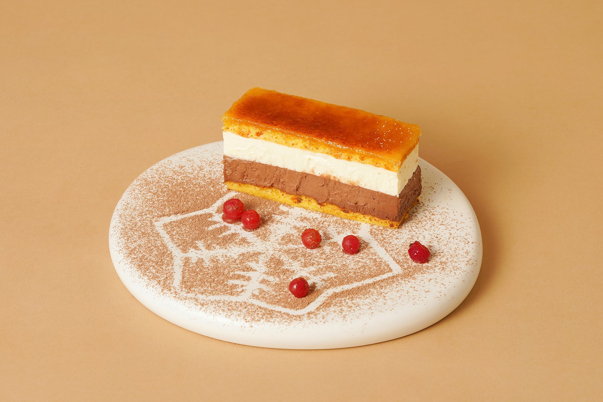 フランスの伝統菓子である”サンマルク”を、Minimal流にアップデートしました。一般的にはチョコレートクリームとバニラクリームが使われますが、Minimalではバニラクリームをホワイトチョコレートに置き換え、ミルキーな味わいに仕立てています。